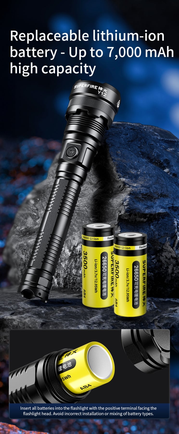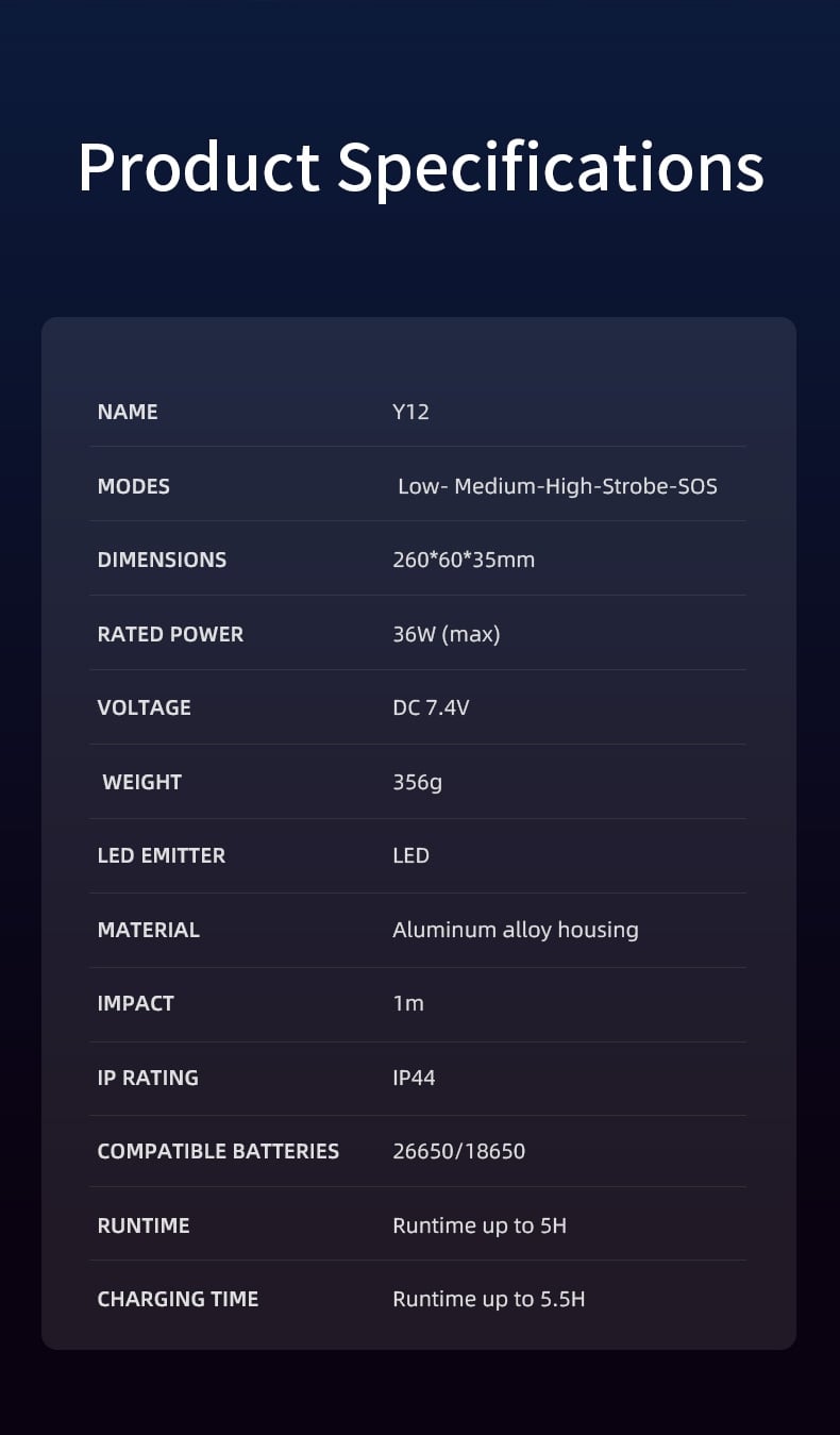 Power source: 2*26650 rechargeable Li-ion battery
