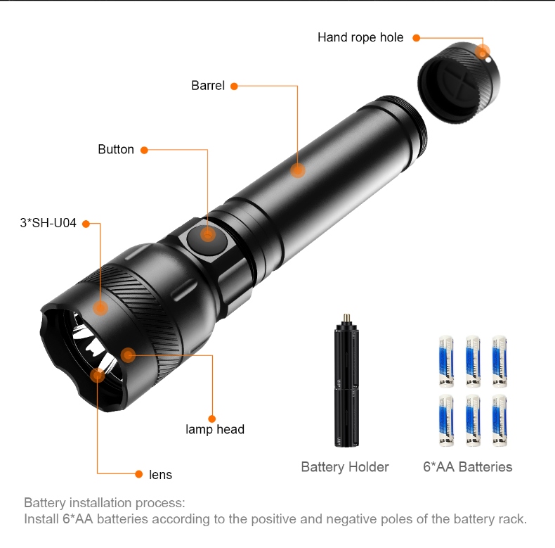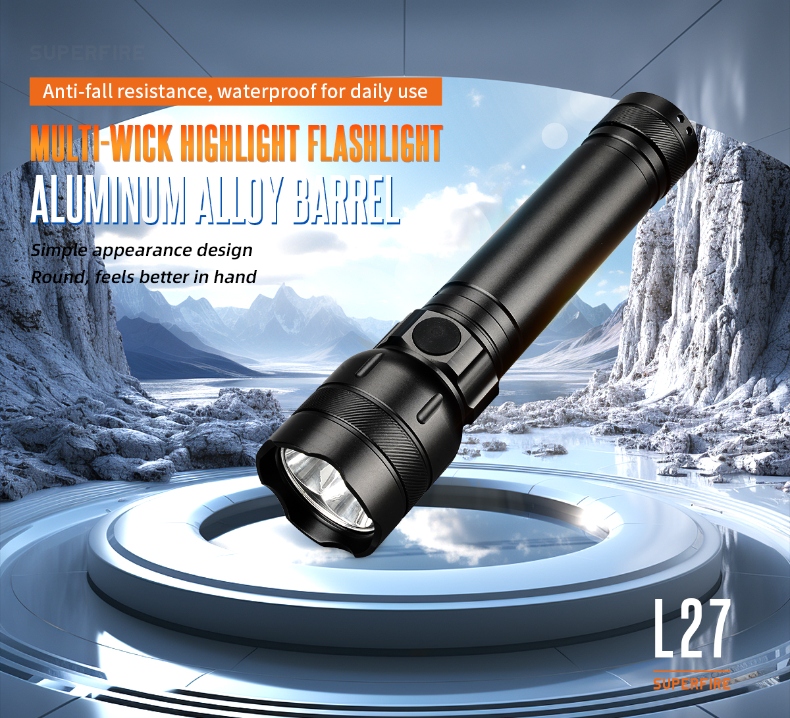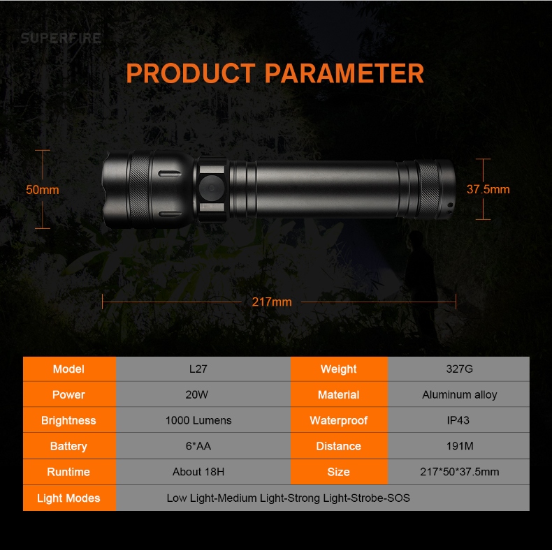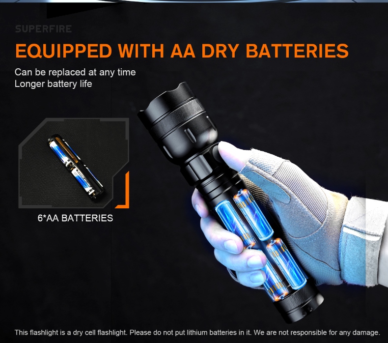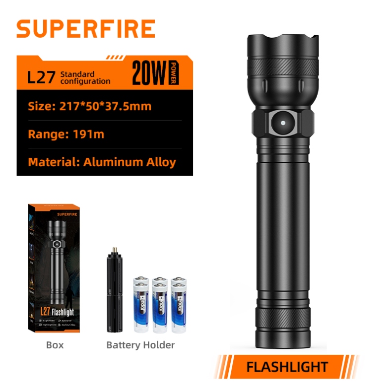 Experience fearlessness in the dark with the SUPERFIRE L27 Super Bright Dry Battery Flashlight. Engineered for excellence, this multi-wick highlight flashlight is equipped with 3pcs SH-UO4 lamp beads, delivering an astonishing 1350 lumens of brightness. With a sturdy aluminum alloy build, it's a reliable companion for any adventure or emergency.Powered by 6*AA dry batteries, the L27 offers a runtime of about 4.7 hours, providing a reliable source of light when you need it the most. The convenience of easily replaceable batteries ensures uninterrupted functionality, making it a practical choice for extended use.Crafted with Seiko quality, the L27 is designed to withstand the rigors of daily life. The aluminum alloy material not only provides anti-drop and impact resistance but also ensures life waterproof capabilities, making it a dependable tool for various emergencies.
