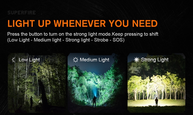 5.Versatile Lighting Modes: Strong, Medium, Low, Strobe