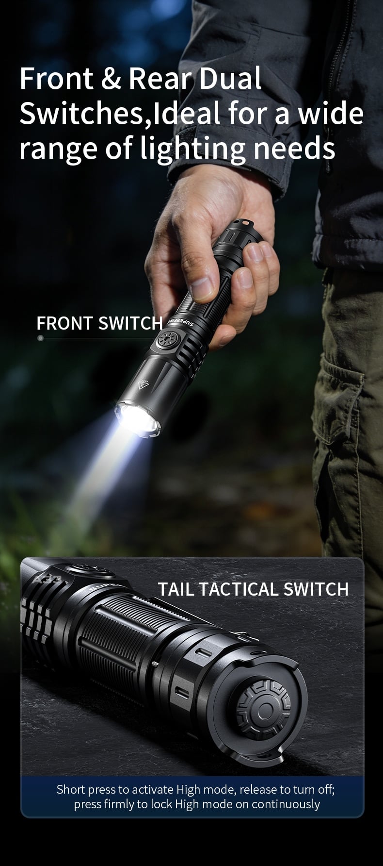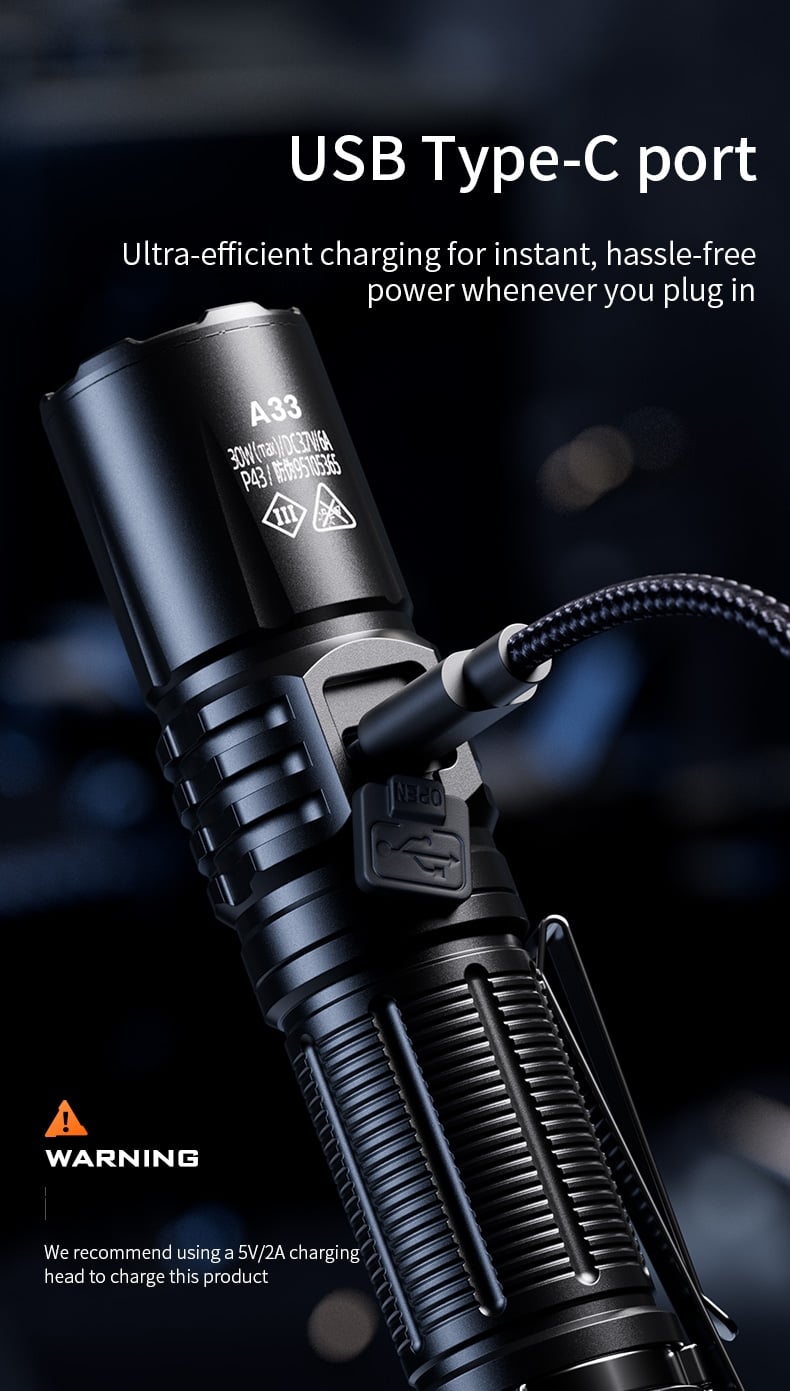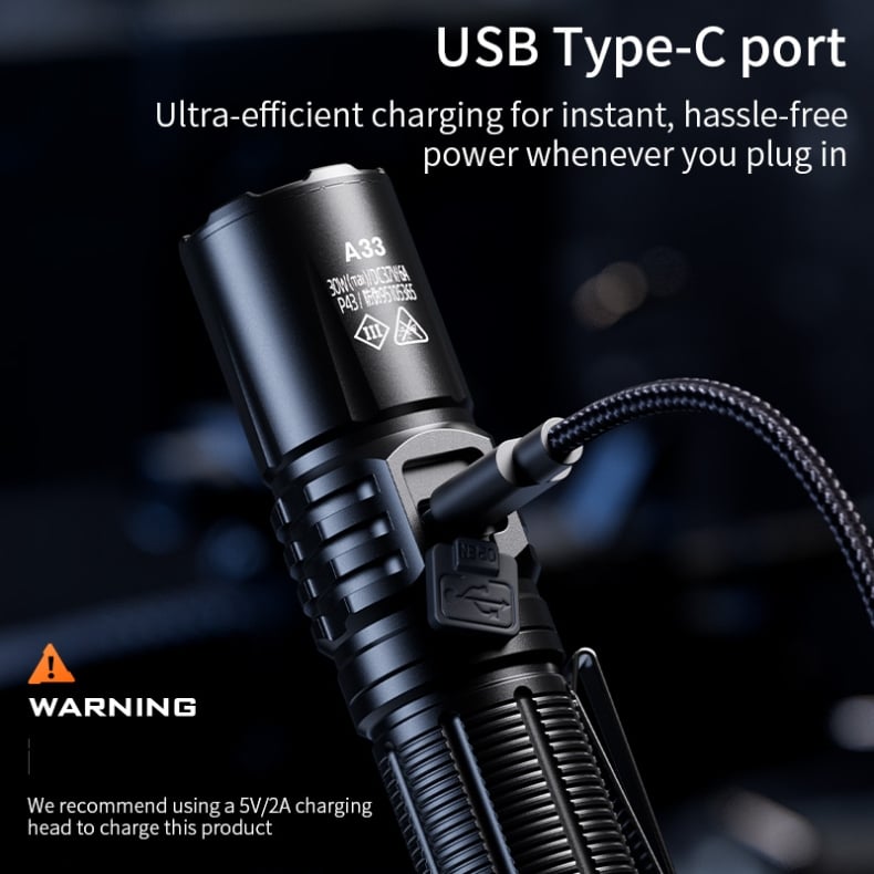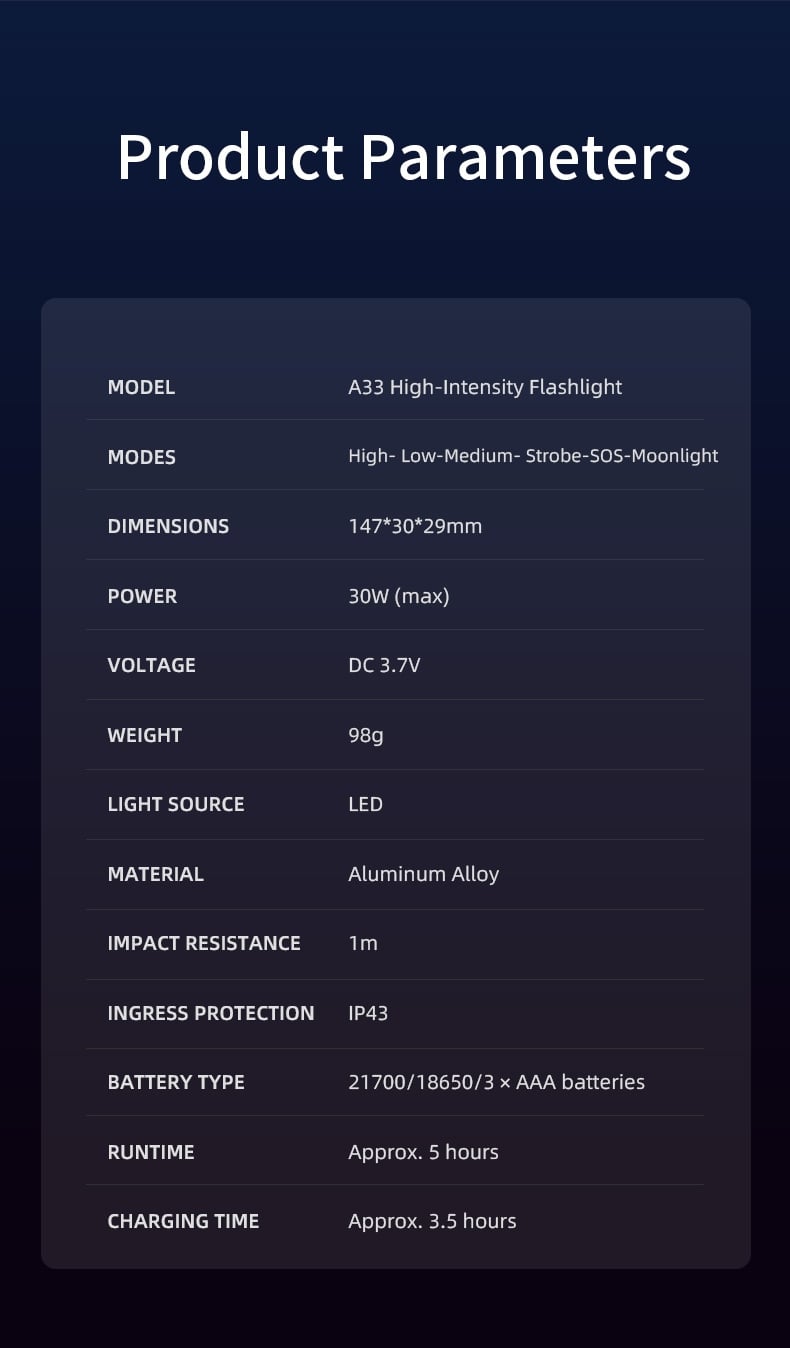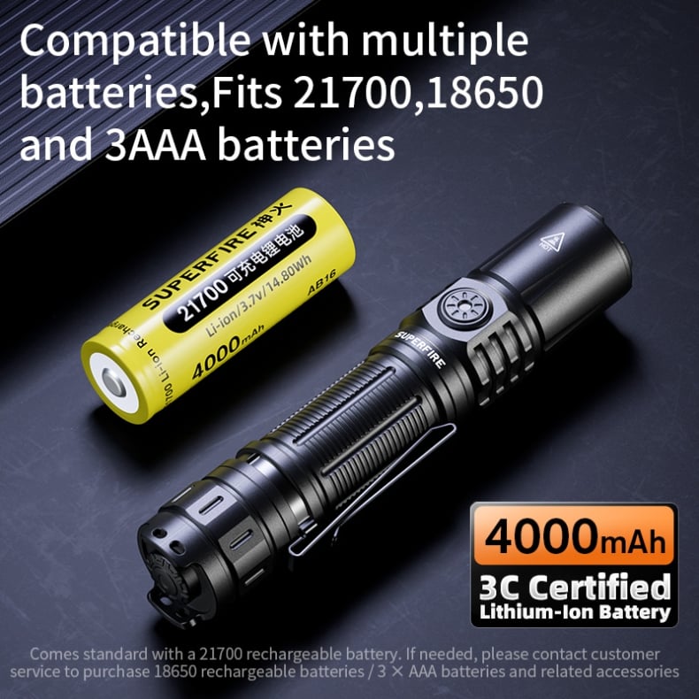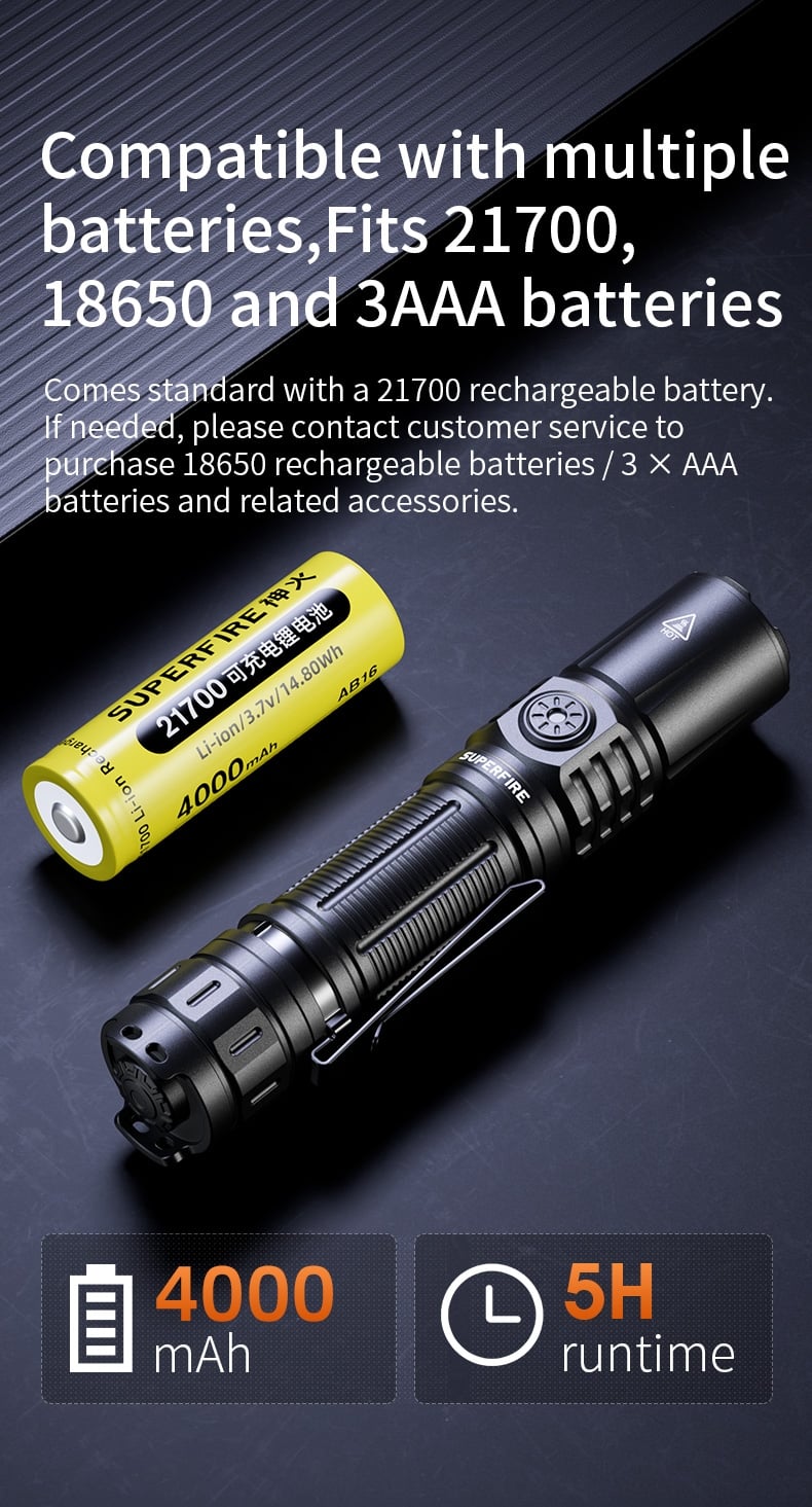 Compatible with 21700 / 18650 / 3×AAA batteries, offering multiple battery options and allowing quick battery replacement when needed.