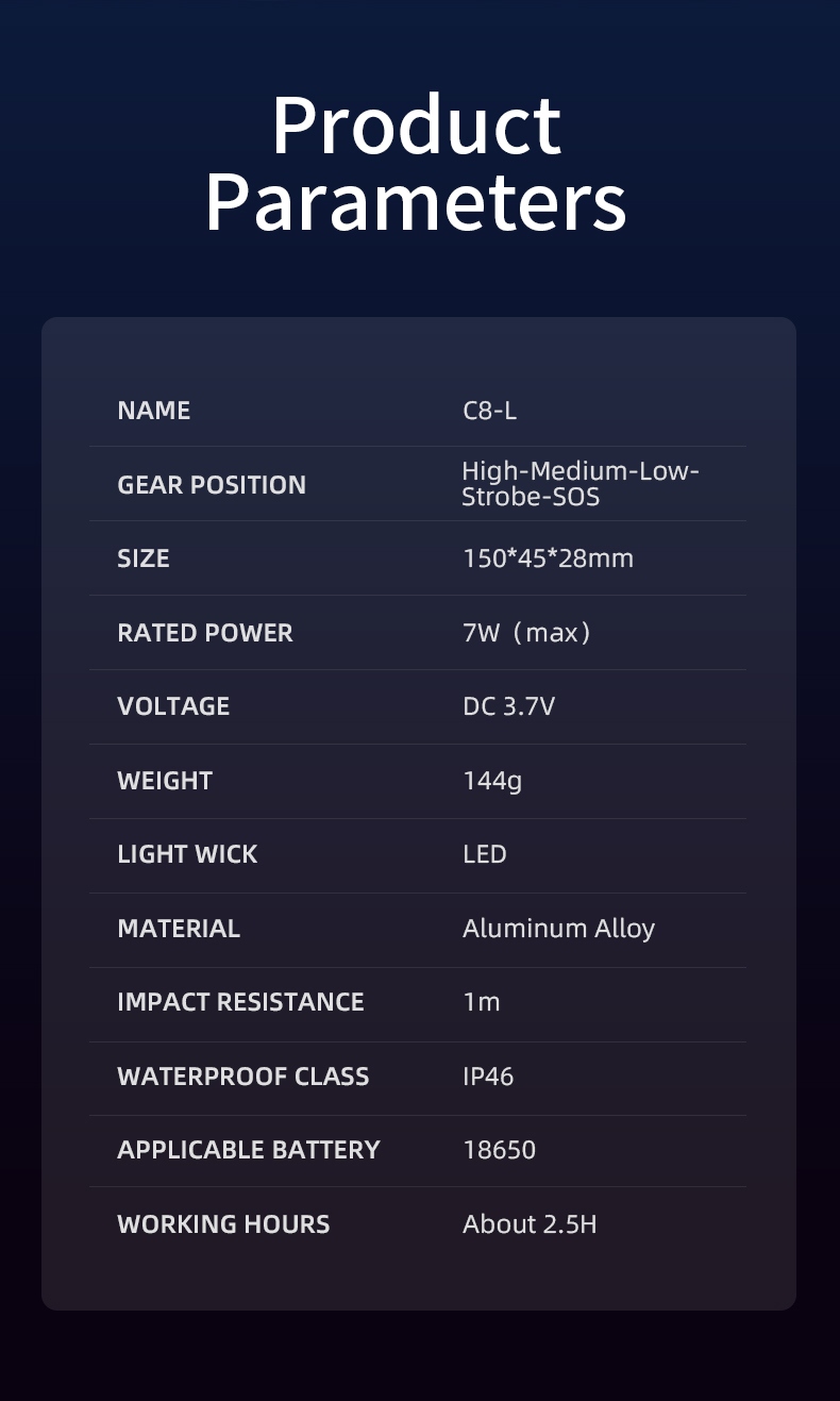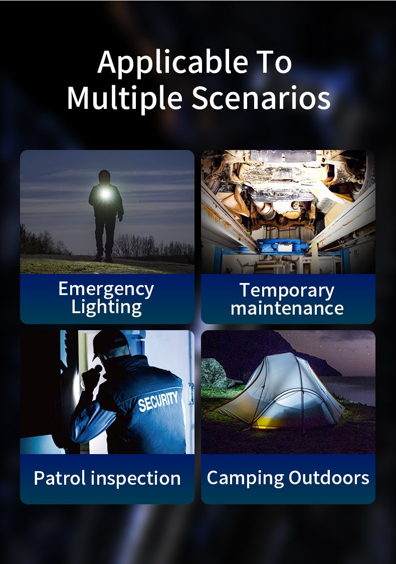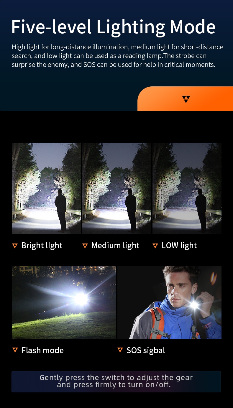 Five dimming levels: high light, medium light, low light, strobe light, and SOS light, cater to different scenarios.