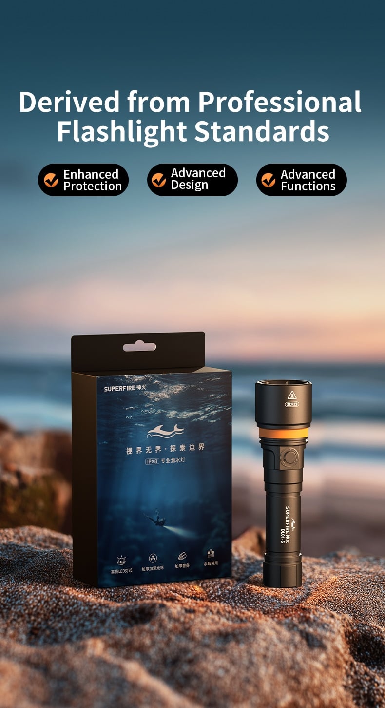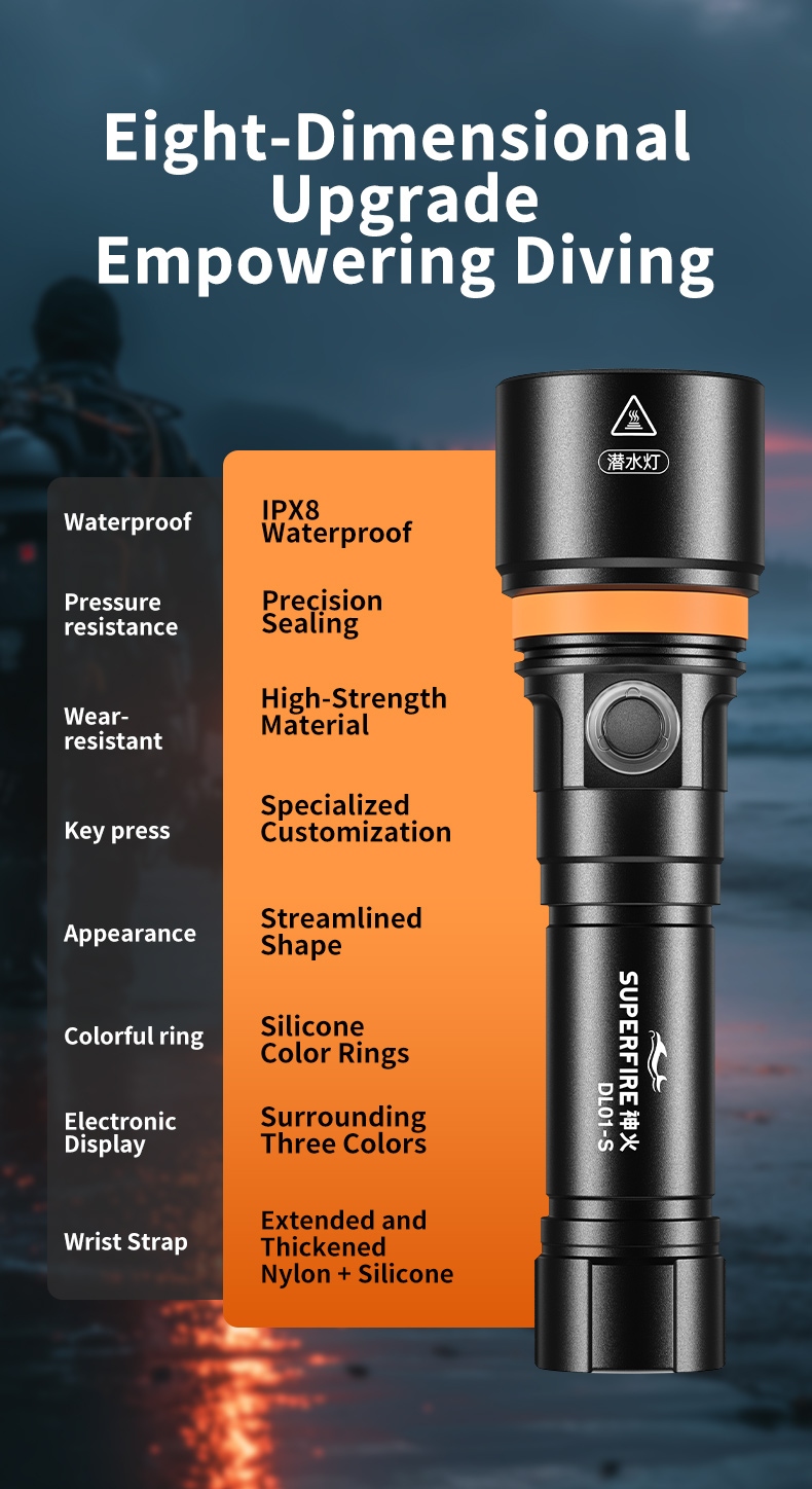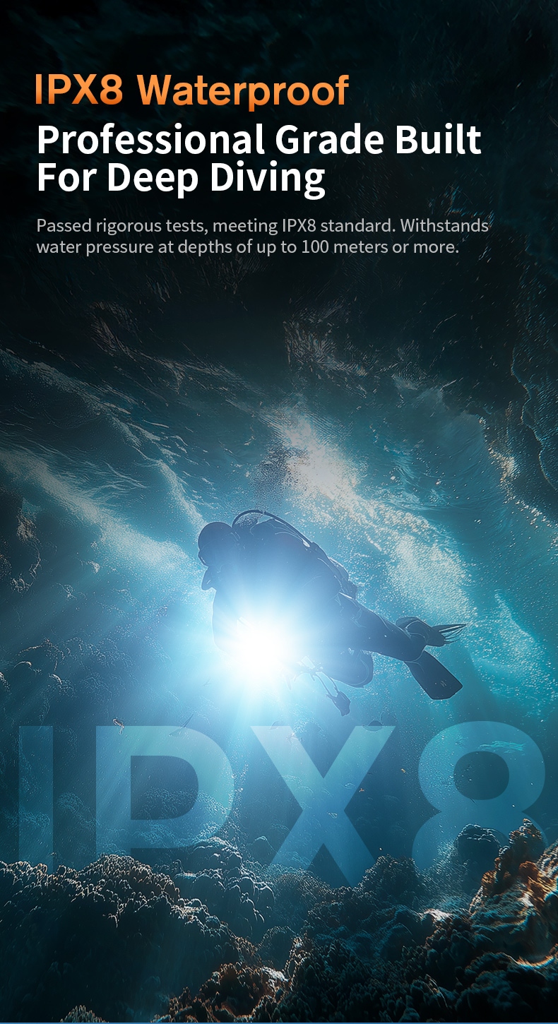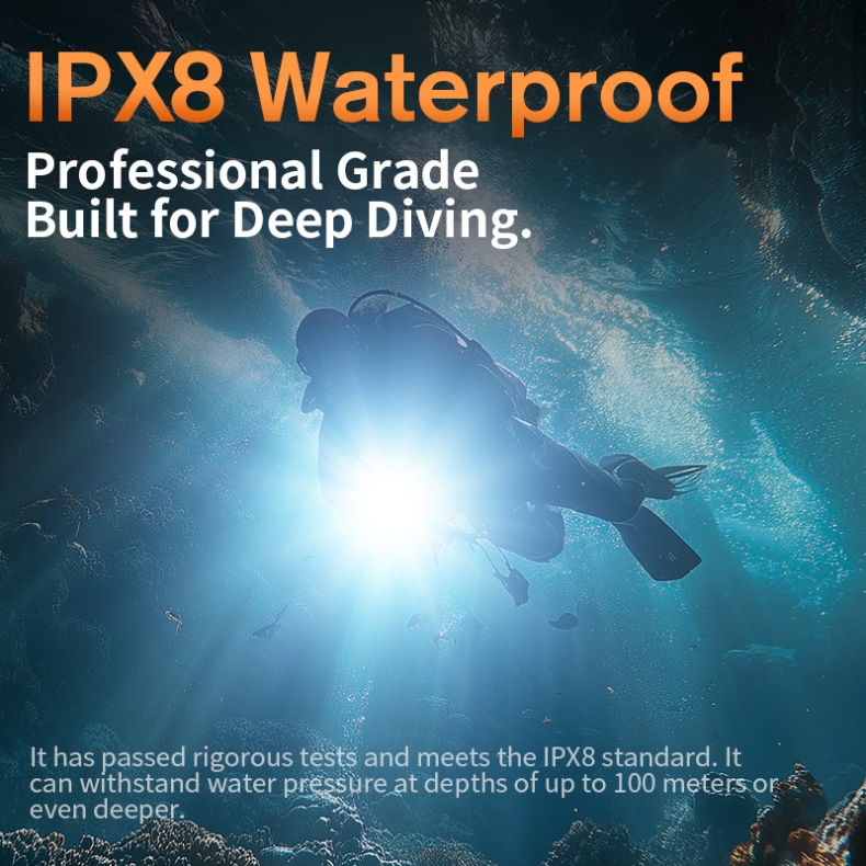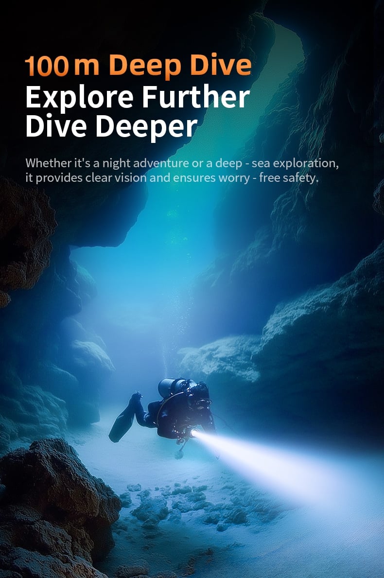 Professional IP68 Waterproof Performance: Rigorously tested to meet IP68 protection standards, this flashlight can withstand underwater pressure at depths up to 100 meters (even deeper in some cases), ensuring stable operation for deep-sea exploration, scuba diving, and other underwater activities. The sealed structure effectively prevents water intrusion, safeguarding internal components.