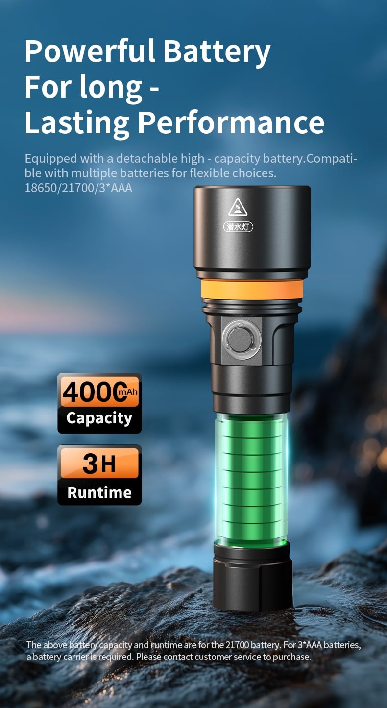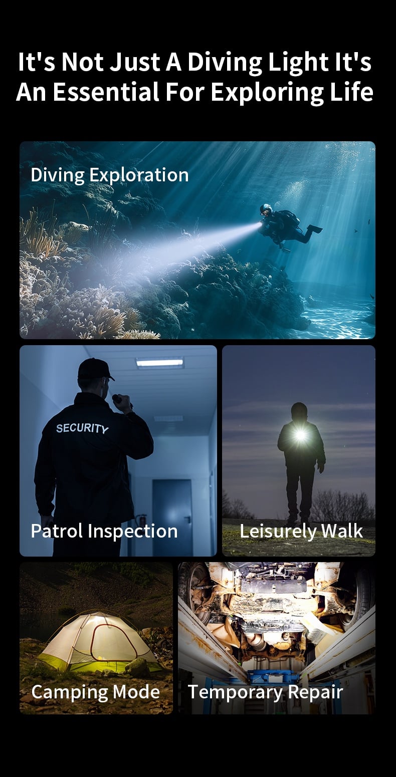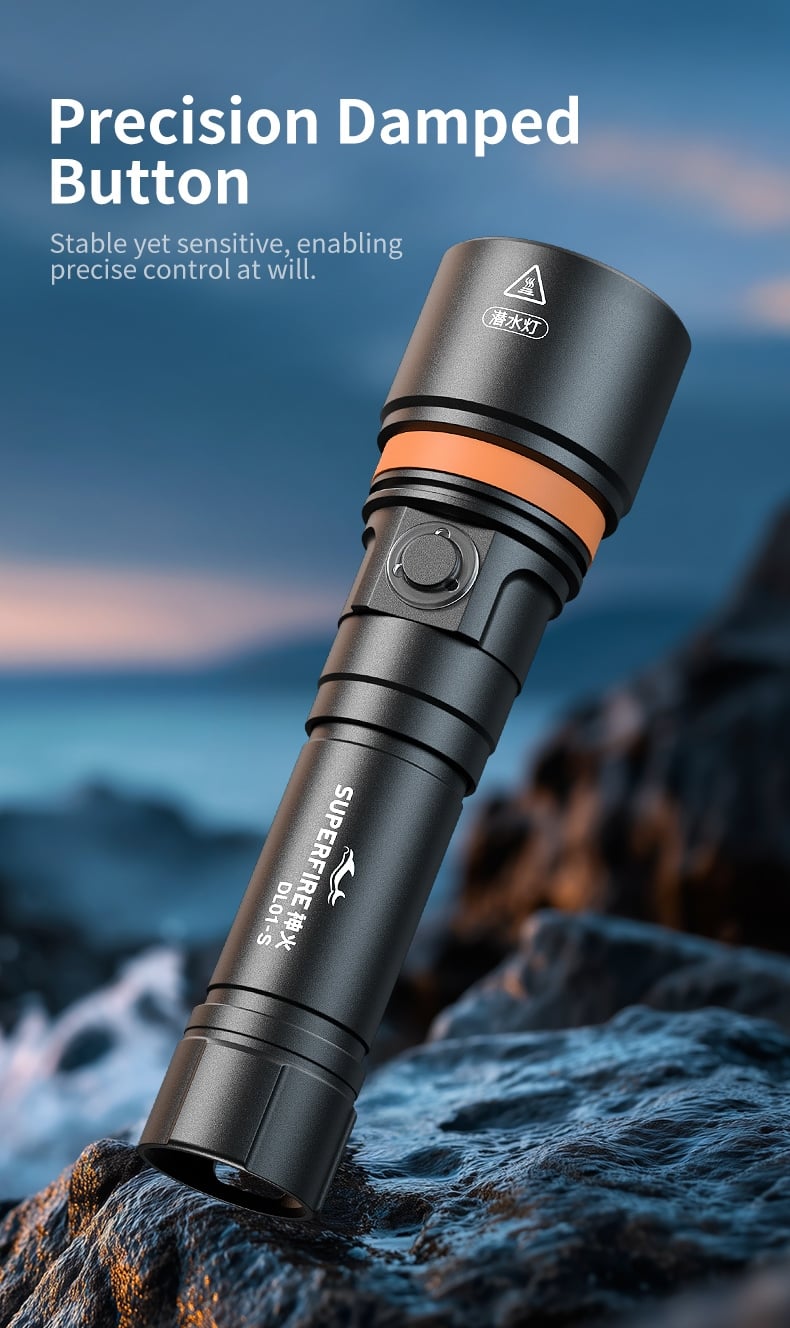 Glove-Friendly & Multi-Mode Operation: Designed with a button switch, it allows easy operation even when wearing diving gloves, eliminating operational obstacles underwater. It supports multiple lighting modes switching, adapting to different diving scenarios such as exploration, signaling, and close-range lighting.