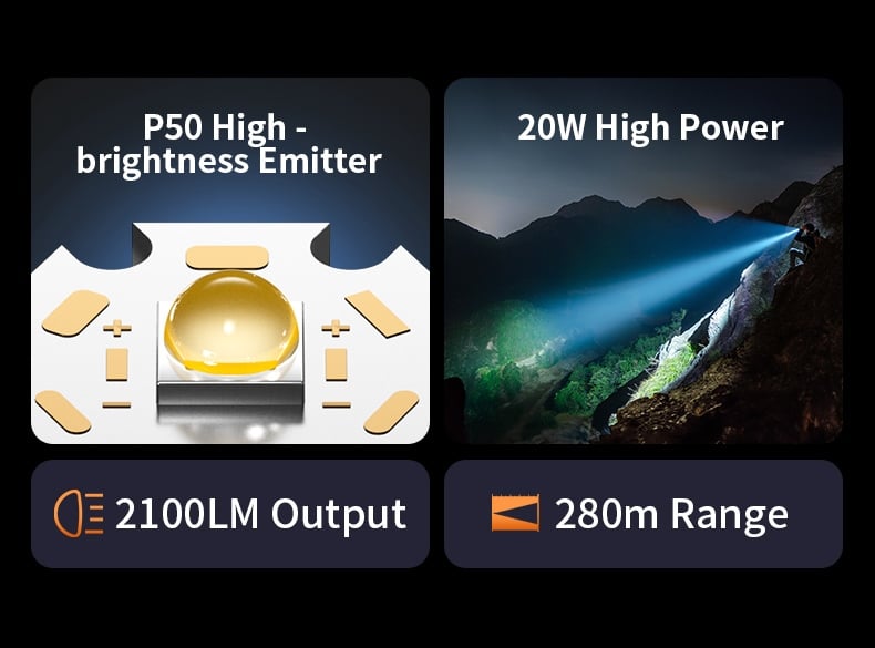 Powerful Illumination & Long Range: Equipped with a P50 LED bulb and 20W maximum power, it emits 2100 lumens of 7000K cool white light with a maximum range of 280 meters. The high-transparency optical lens and precise optical design ensure uniform light distribution, strong penetration, and clear visibility in turbid underwater environments.
