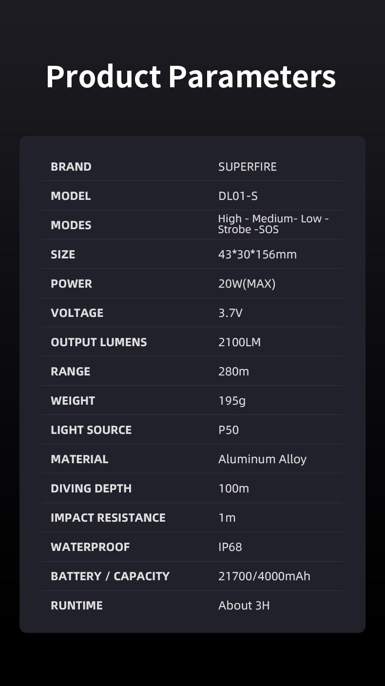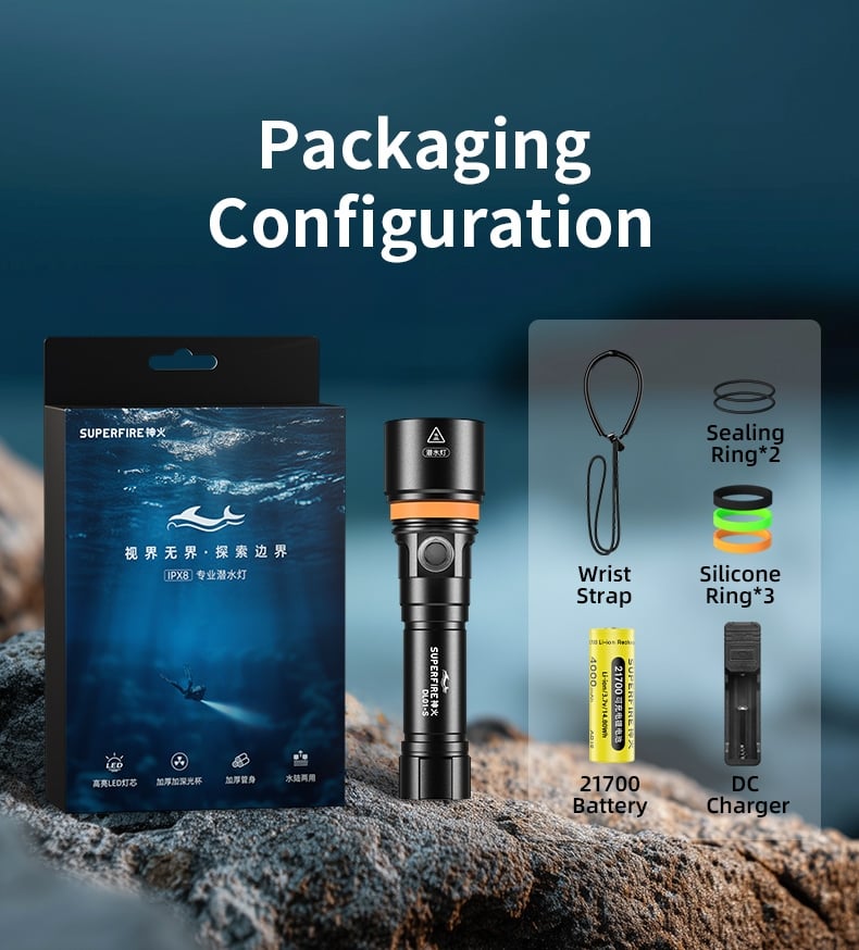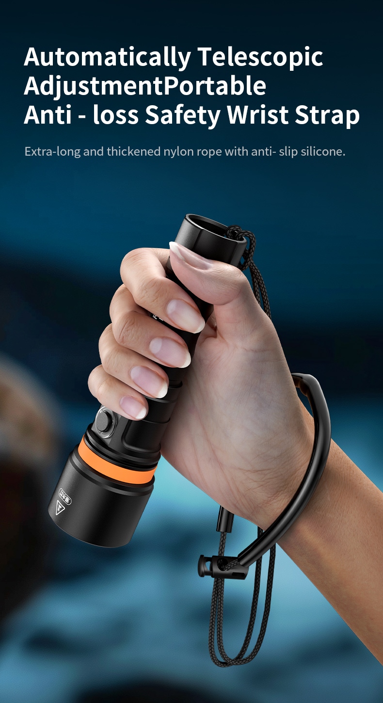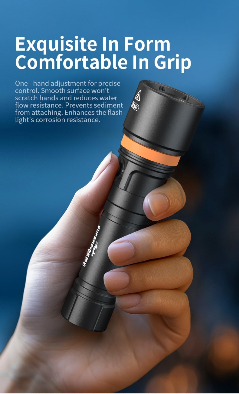 Ergonomic & Portable Design: Weighing only 195g with dimensions of 43*30*156mm, the flashlight adopts an ergonomic shape that fits comfortably in the hand. The lightweight design reduces burden on divers, while the compact size facilitates easy storage in diving bags or attachment to gear.