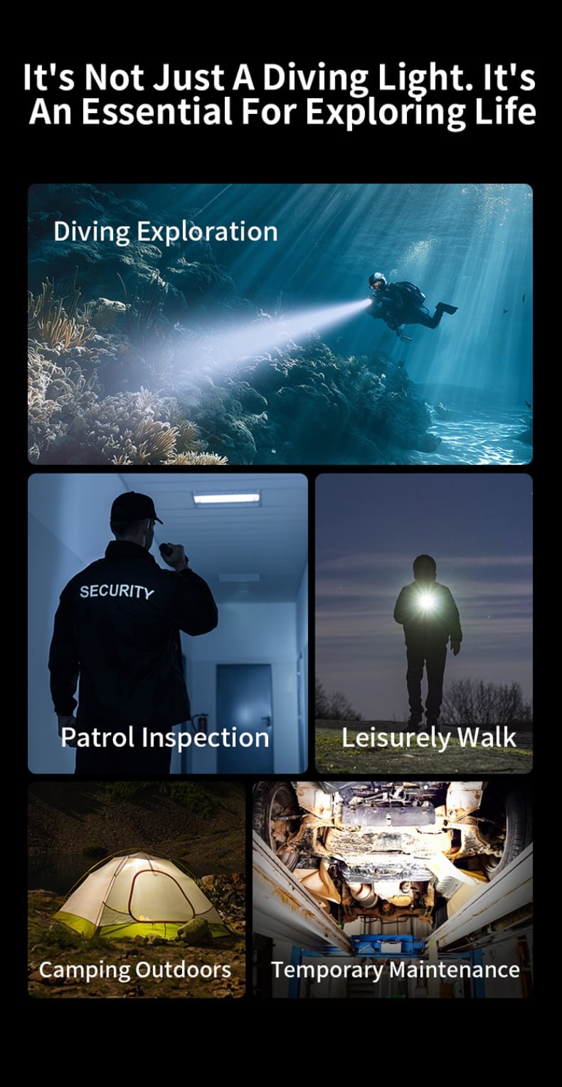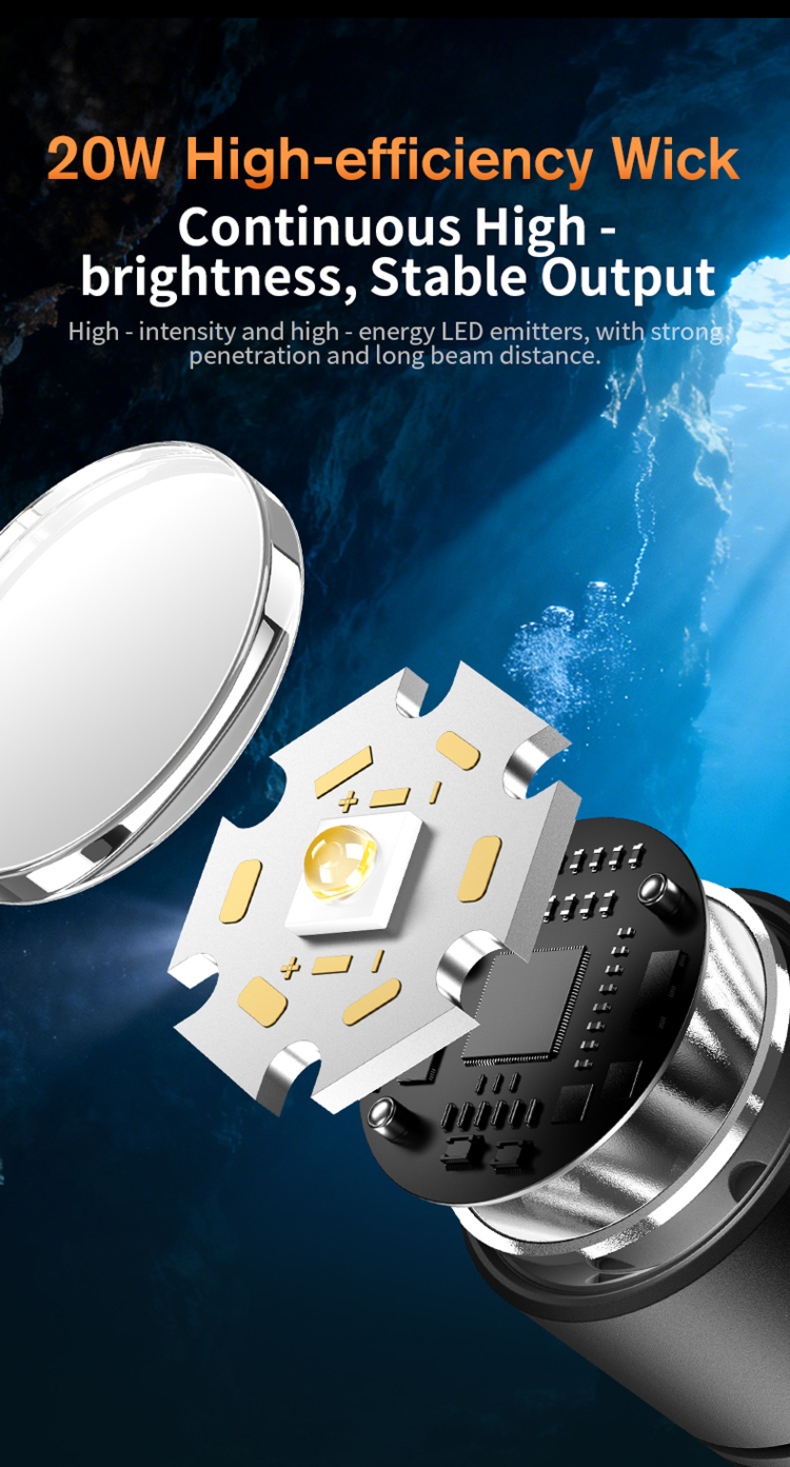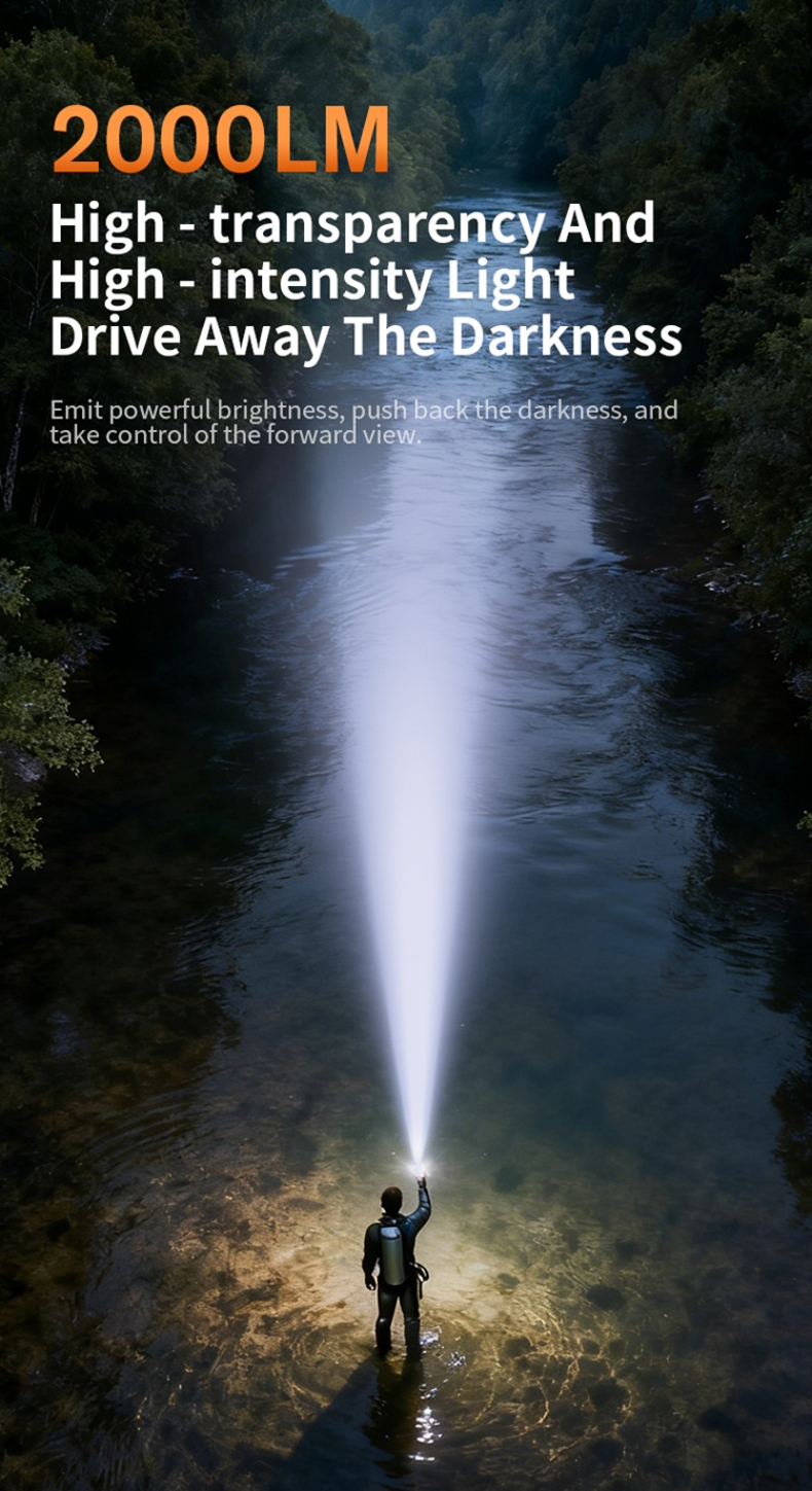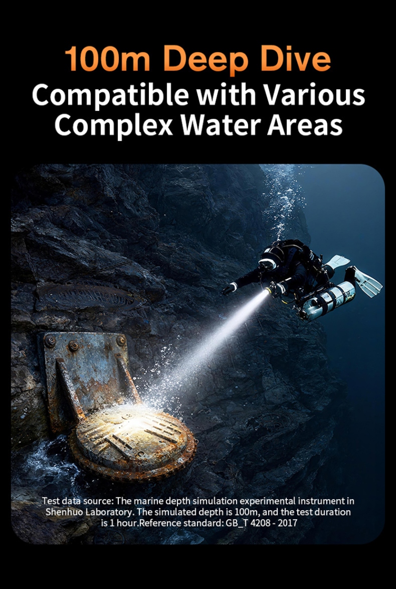 Professional Waterproof Design: Strictly tested to meet IP68 standard, capable of withstanding water pressure up to 100 meters or deeper. It effectively prevents water ingress, ensuring stable lighting performance even in deep-sea environments, making it an ideal companion for deep-sea exploration.