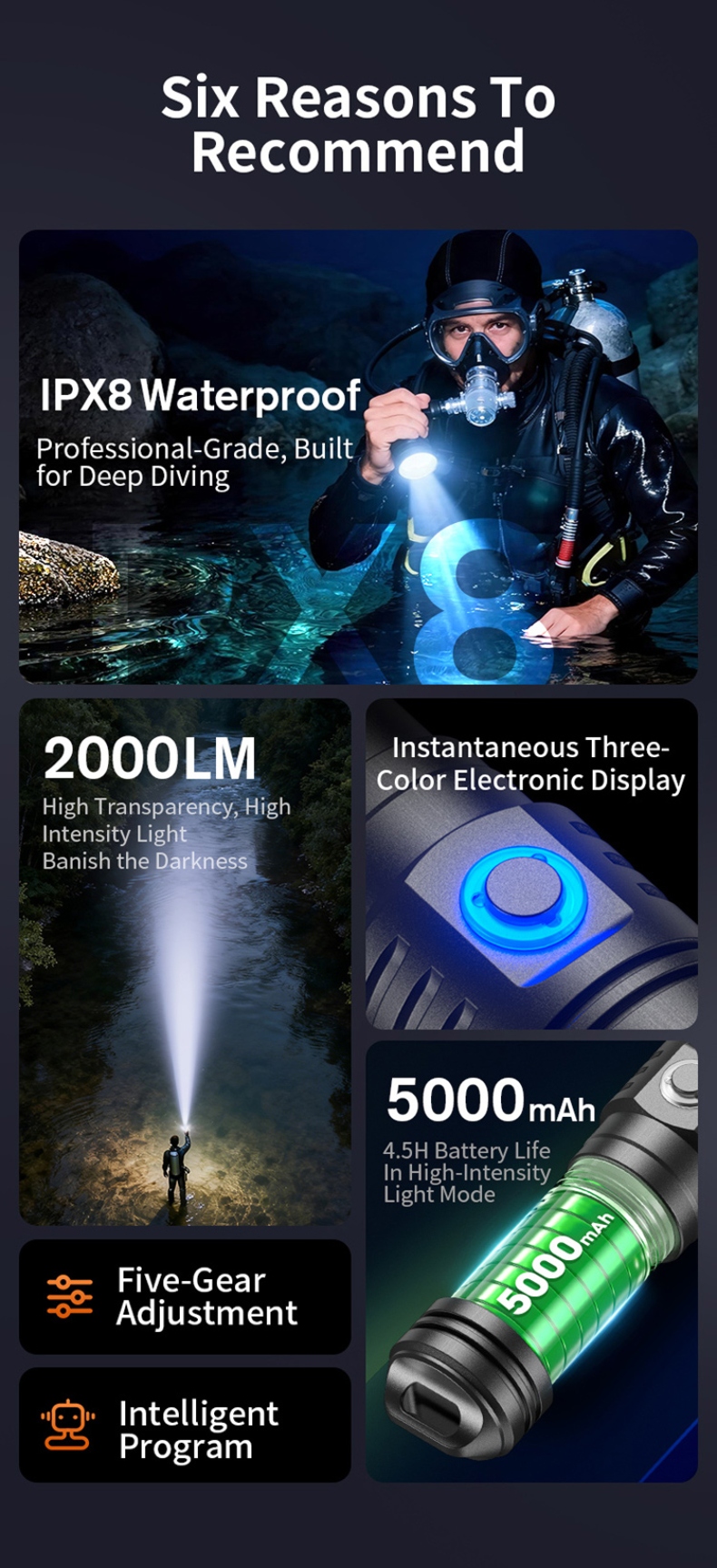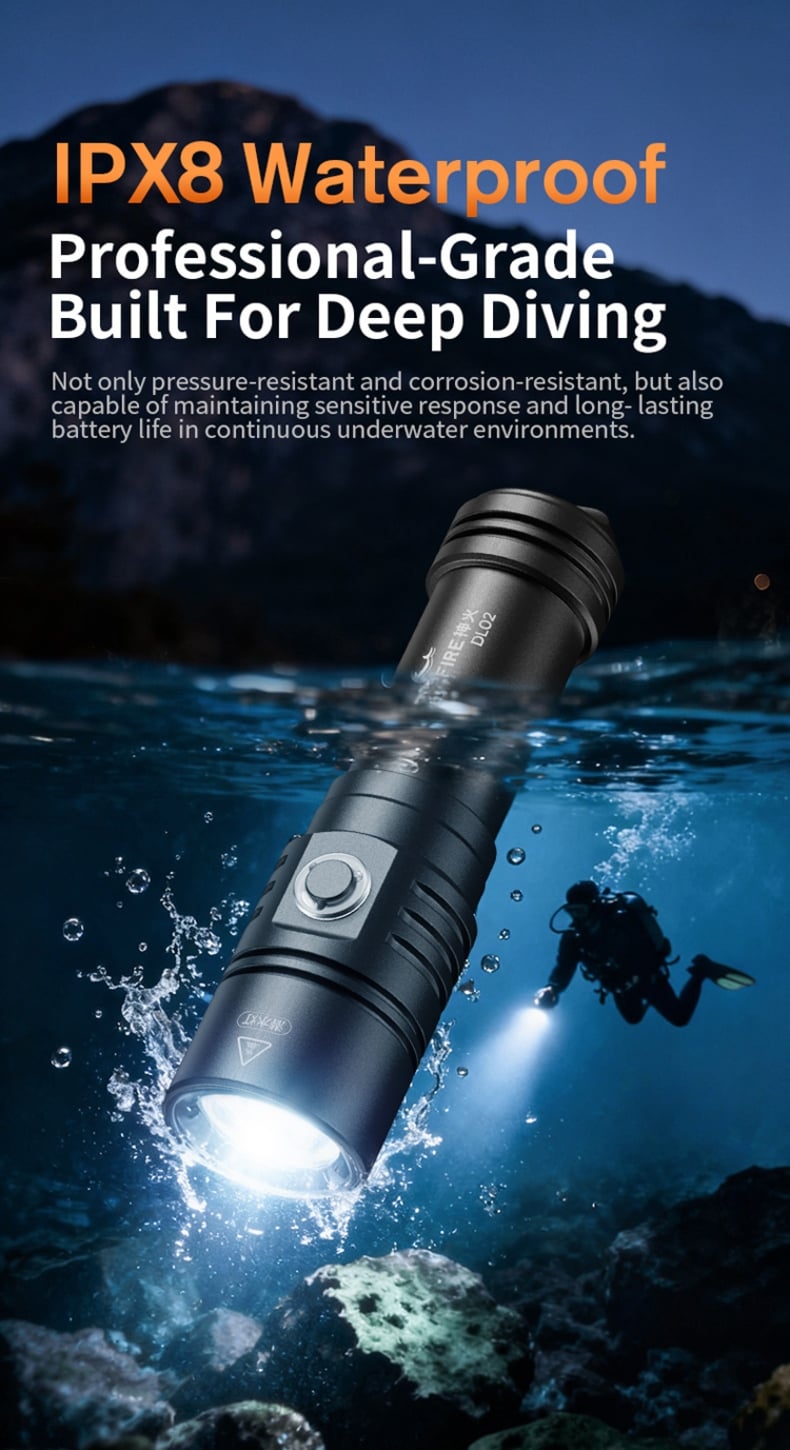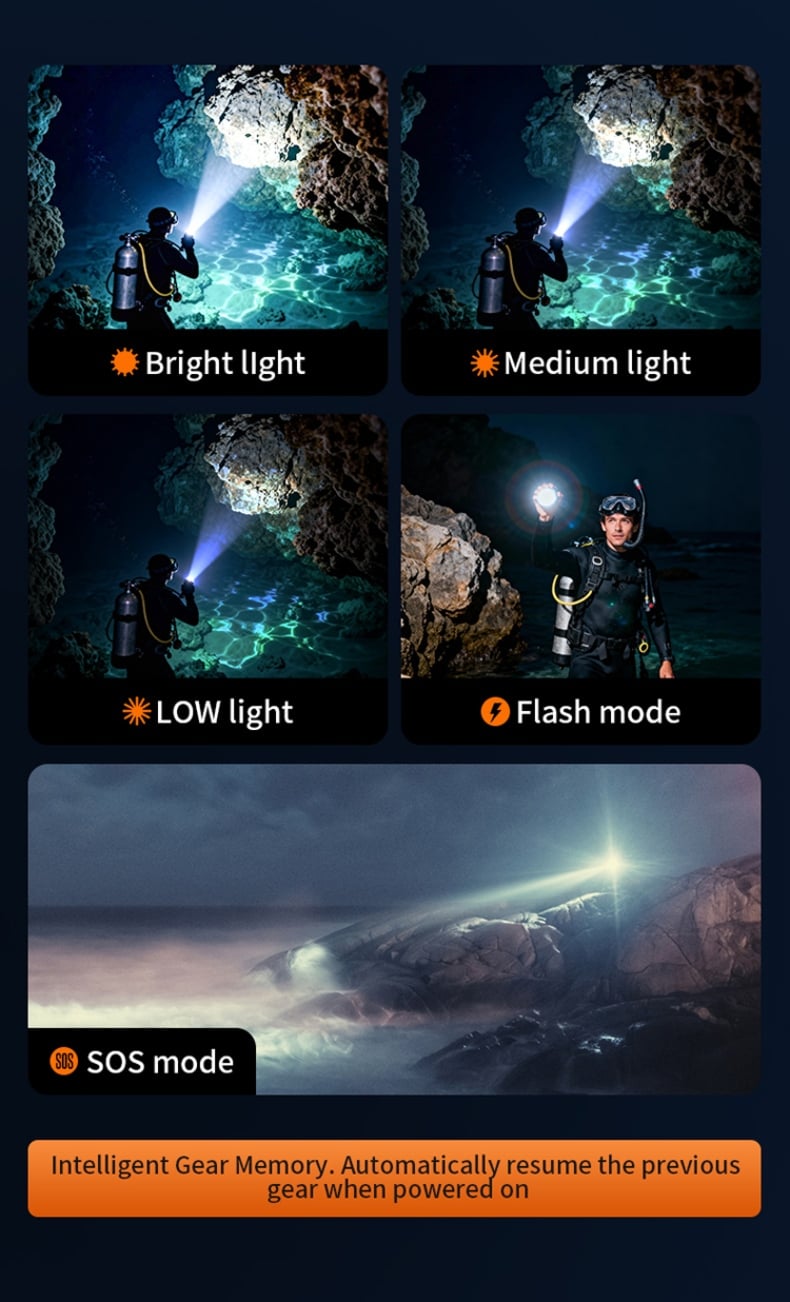 Professional Waterproof Design: Strictly tested to meet IP68 standard, capable of withstanding water pressure up to 100 meters or deeper. It effectively prevents water ingress, ensuring stable lighting performance even in deep-sea environments, making it an ideal companion for deep-sea exploration.