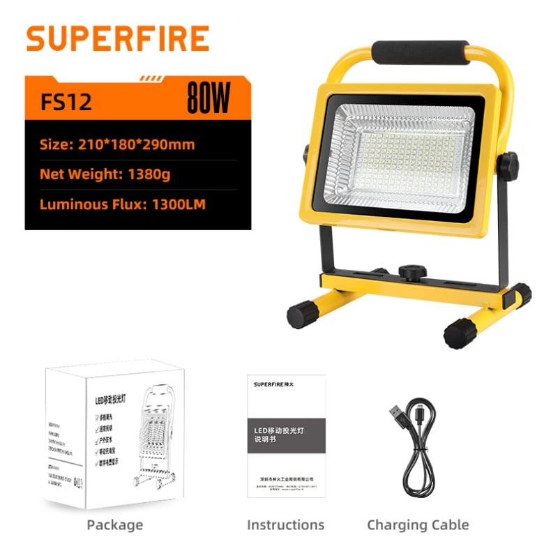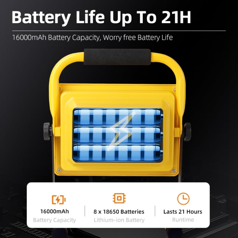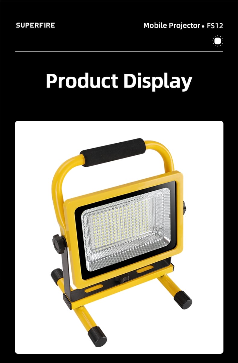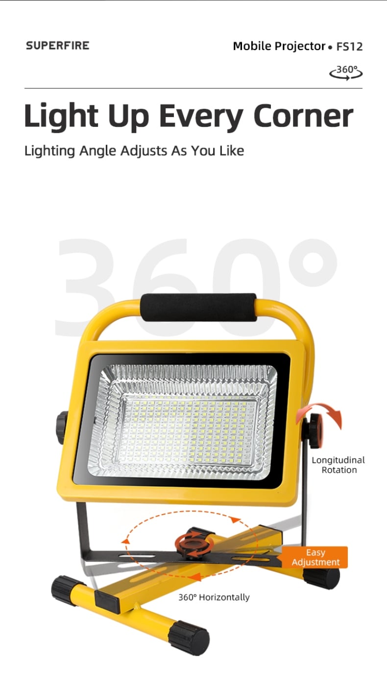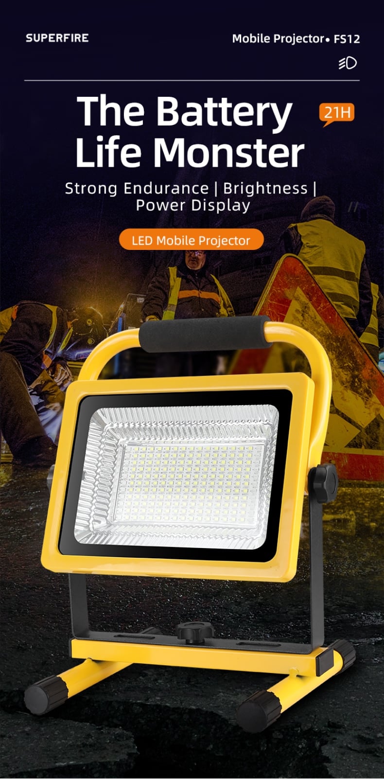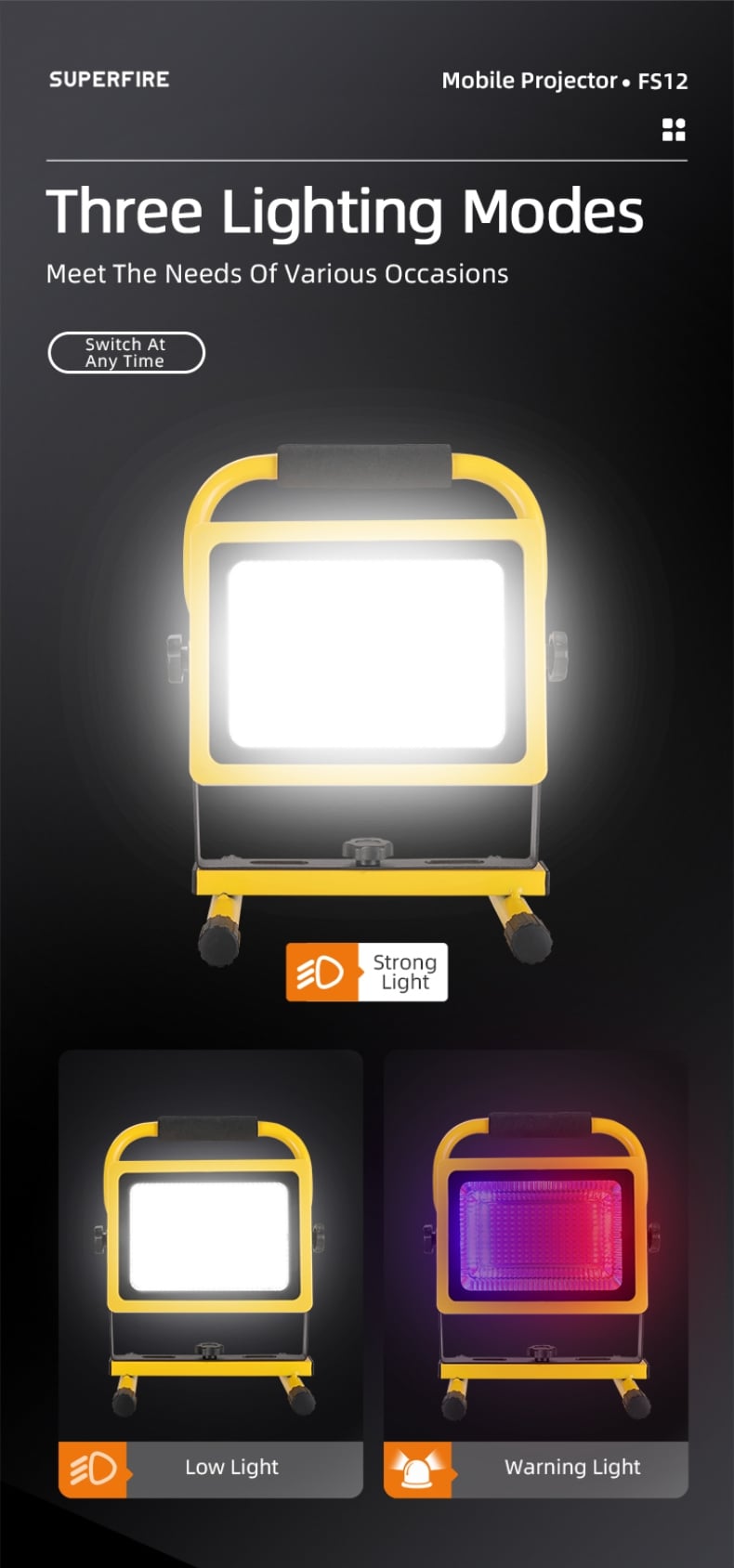 SUPERFIRE LED work light is equipped with high-quality 2835 lamp beads (165 white light + 22 colored light), providing ultra-bright 1300LM illumination. It features 3 adjustable light modes (strong light - weak light - warning light) to meet diverse lighting needs. With 360° horizontal and 160° vertical adjustable angles, you can easily direct the light to any desired position. The 16000mAh large-capacity battery ensures long of 11H~21H, and it supports convenient charging via computer, power bank and other devices. Equipped with intelligent digital power display, dual switches for emergency use, and IP54 waterproof rating, this work light is suitable for various scenarios such as outdoor work, camping, emergency rescue and home use.