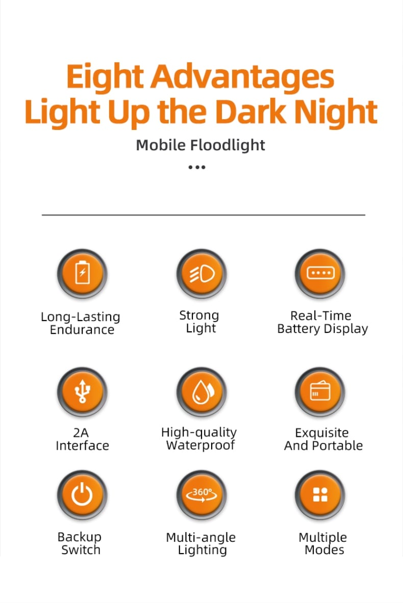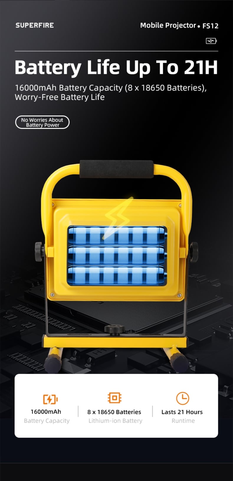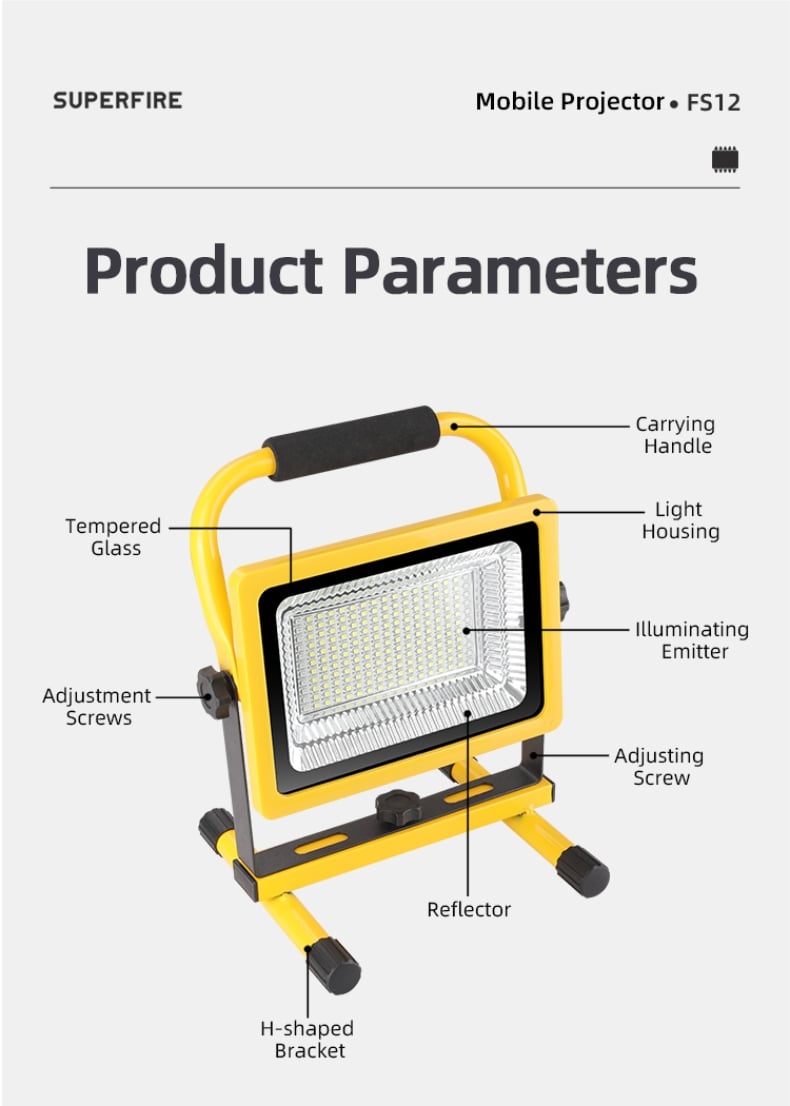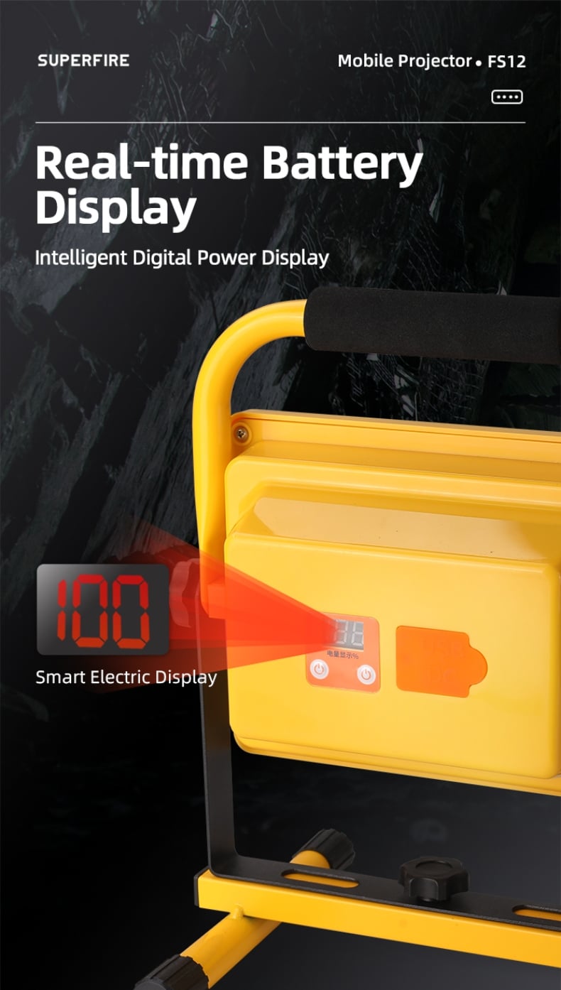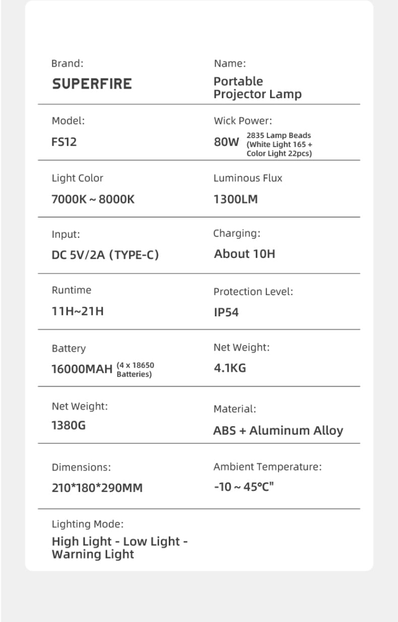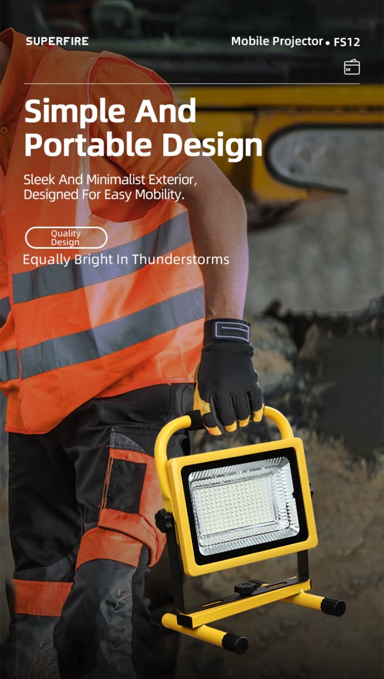 SUPERFIRE LED work light is equipped with high-quality 2835 lamp beads (165 white light + 22 colored light), providing ultra-bright 1300LM illumination. It features 3 adjustable light modes (strong light - weak light - warning light) to meet diverse lighting needs. With 360° horizontal and 160° vertical adjustable angles, you can easily direct the light to any desired position. The 16000mAh large-capacity battery ensures long of 11H~21H, and it supports convenient charging via computer, power bank and other devices. Equipped with intelligent digital power display, dual switches for emergency use, and IP54 waterproof rating, this work light is suitable for various scenarios such as outdoor work, camping, emergency rescue and home use.