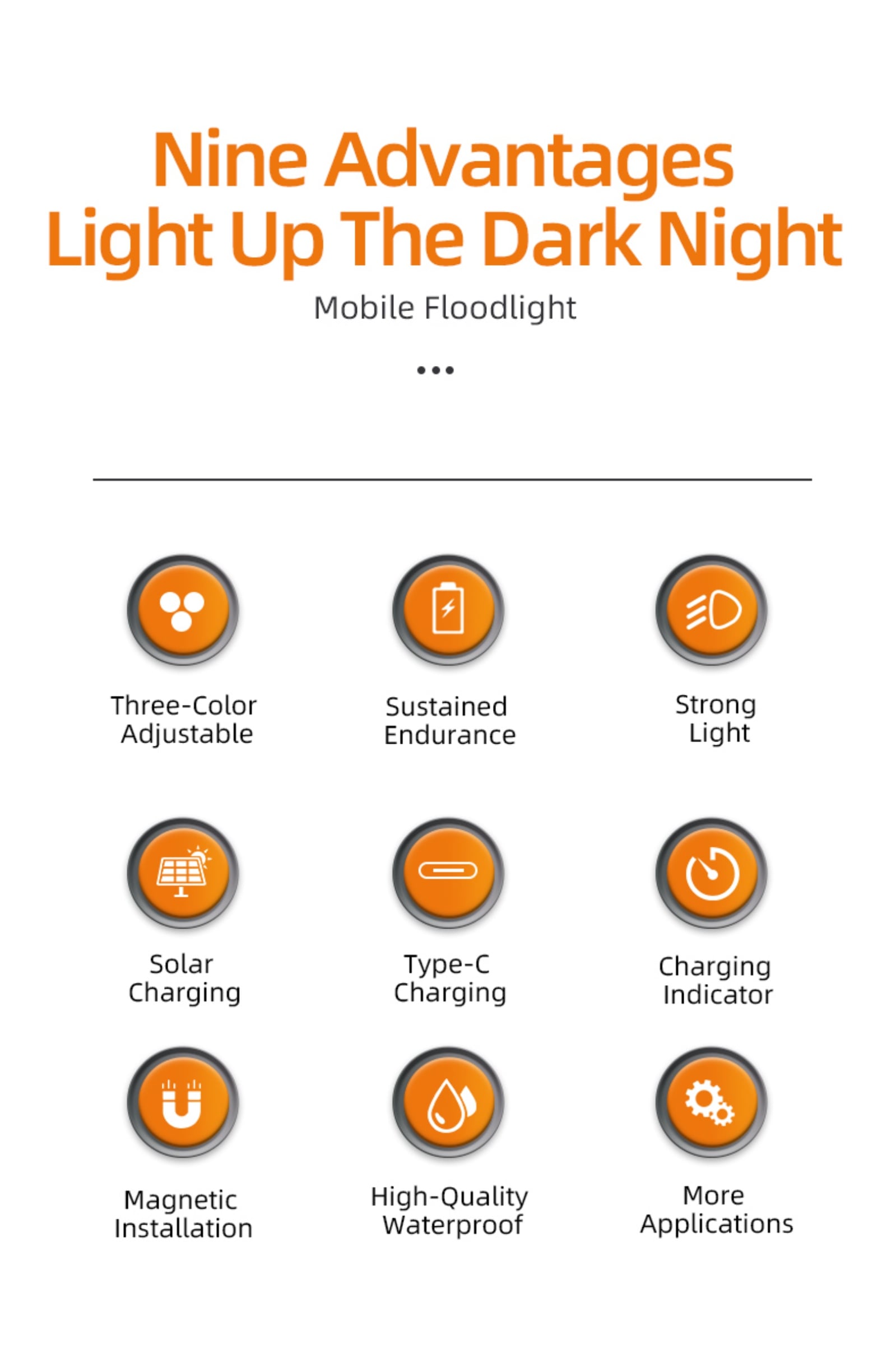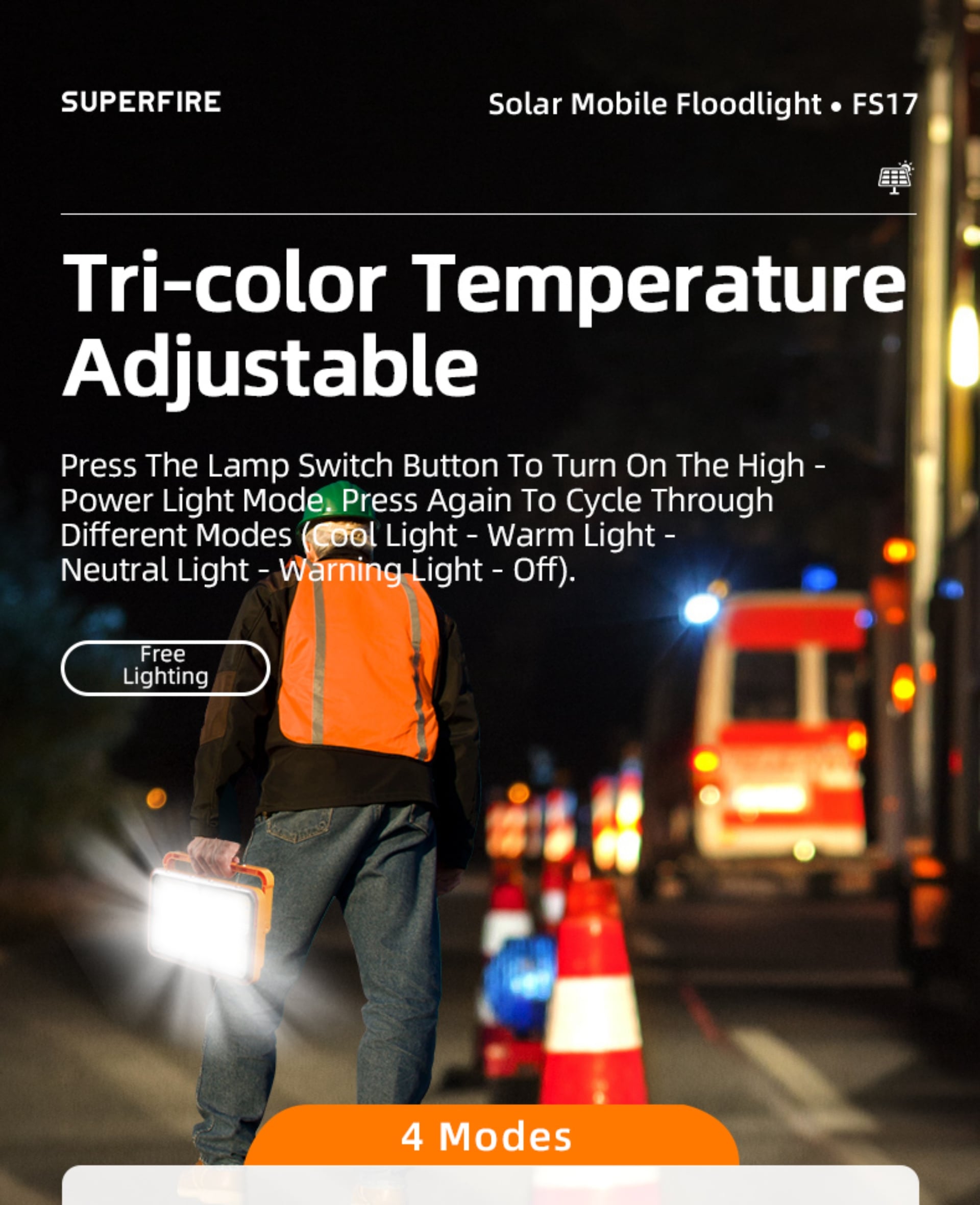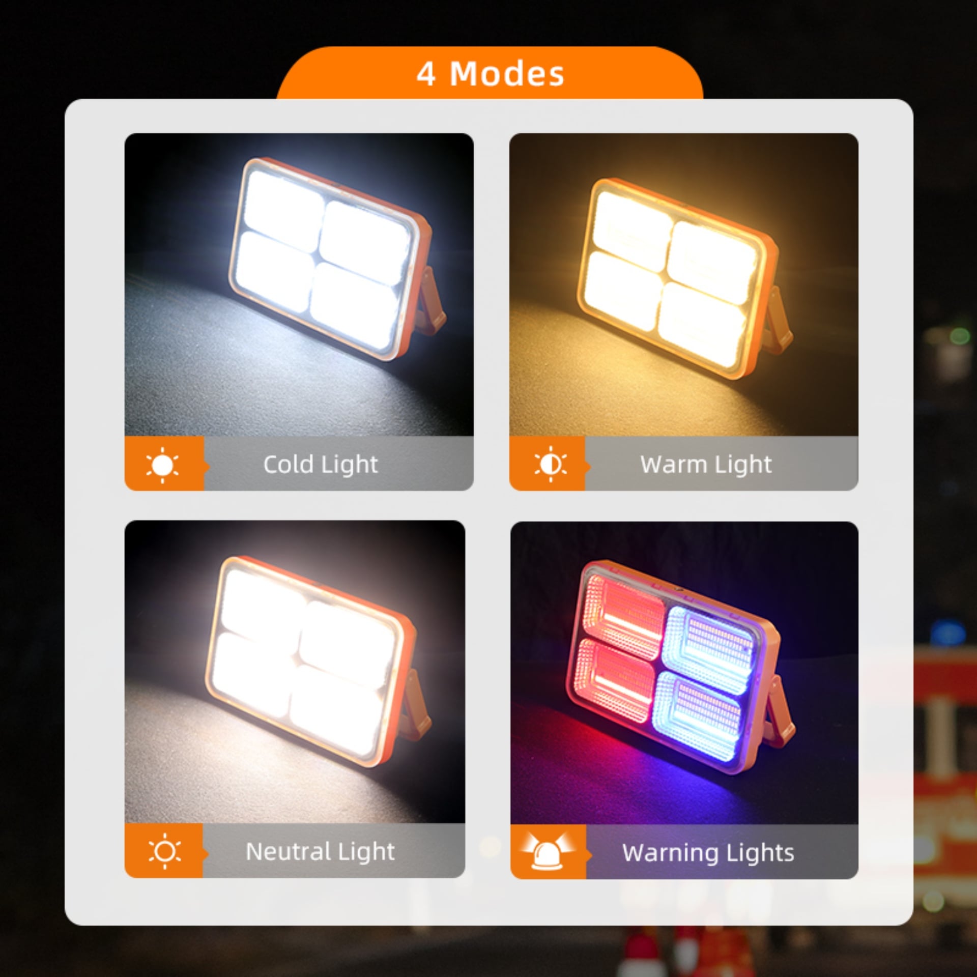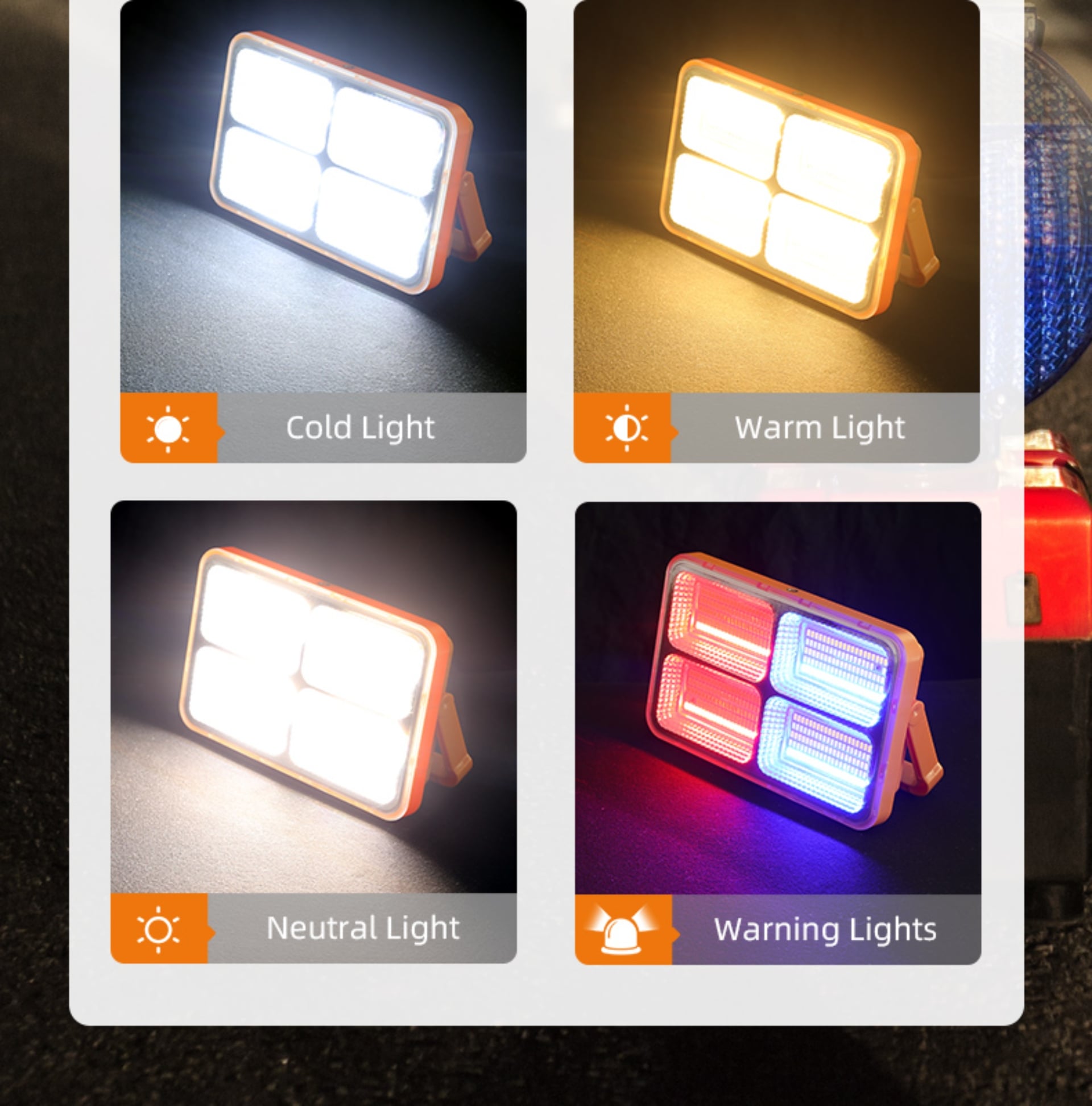 Three adjustable color temperatures for various scenarios. Press the power button to turn on (default high brightness), and press again to switch modes: Cool Light – Warm Light – Neutral Light – Warning Light – Off (cycle switching).