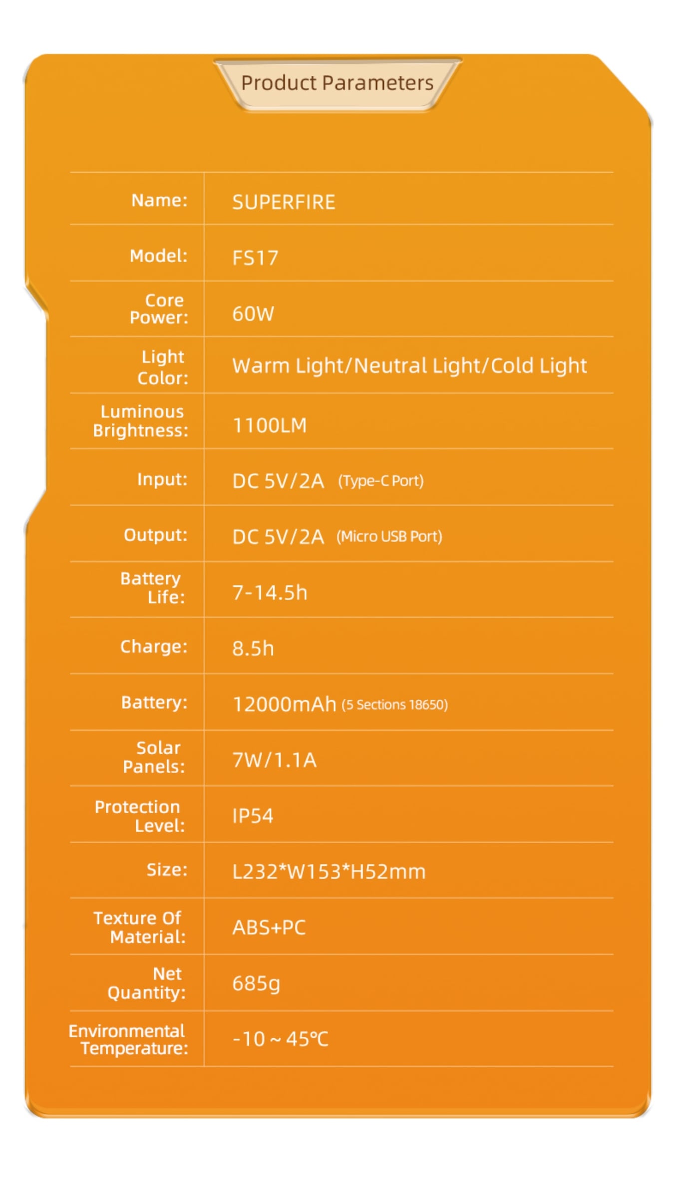 Solar Panel Power/Voltage:7W/1.1A