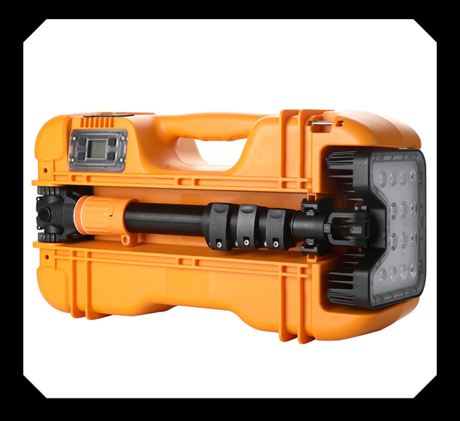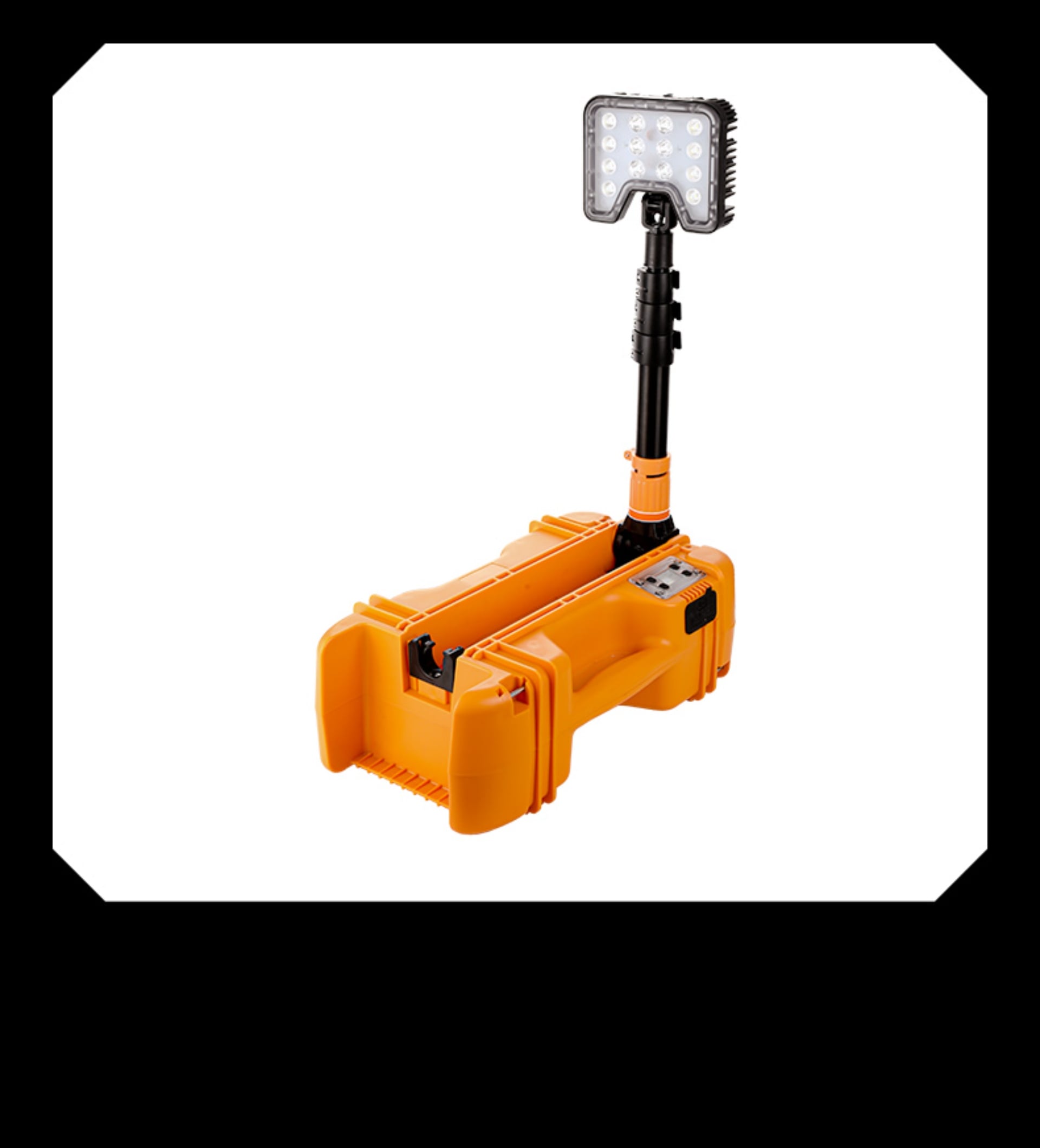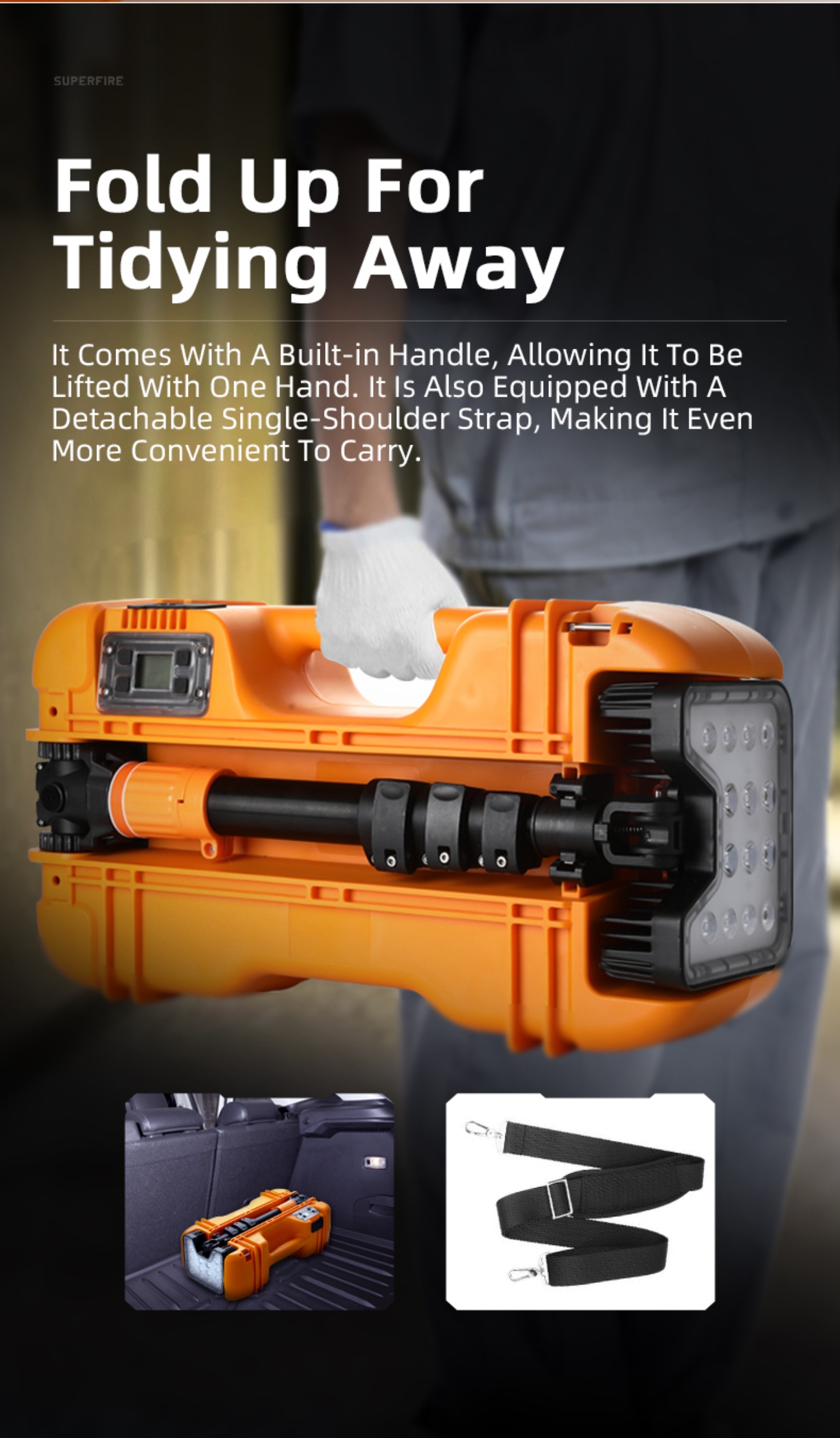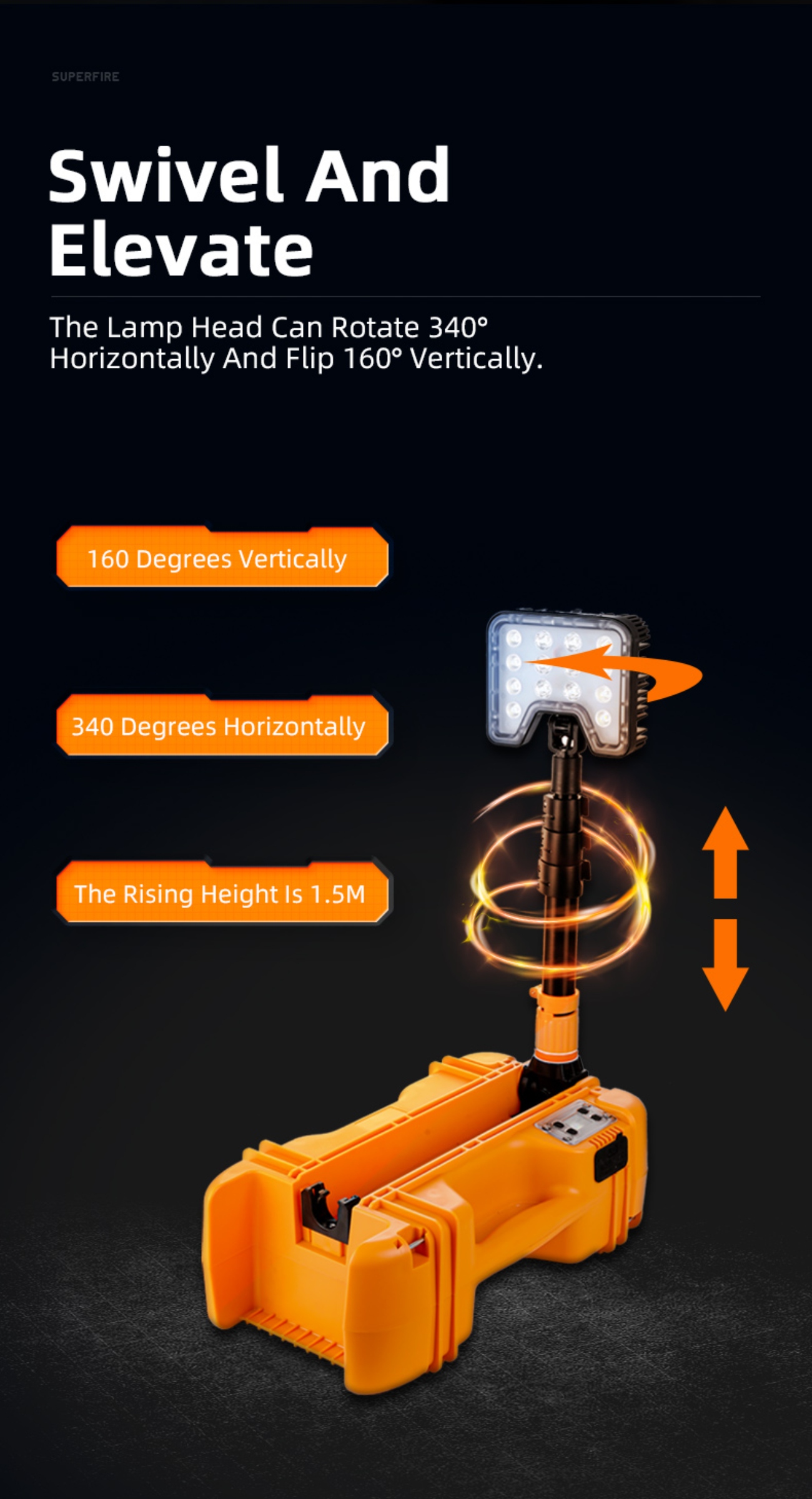 Place the light on a stable surface. Check whether the yellow locking collar at the bottom of the telescopic pole is in the closed position. In this state, pull the lamp head out from the housing and raise it until the pole is vertical. Then twist the yellow locking collar downward to secure the pole. After that, lift the lamp head into position. The lamp head supports 340° horizontal rotation and 160° vertical tilt.
