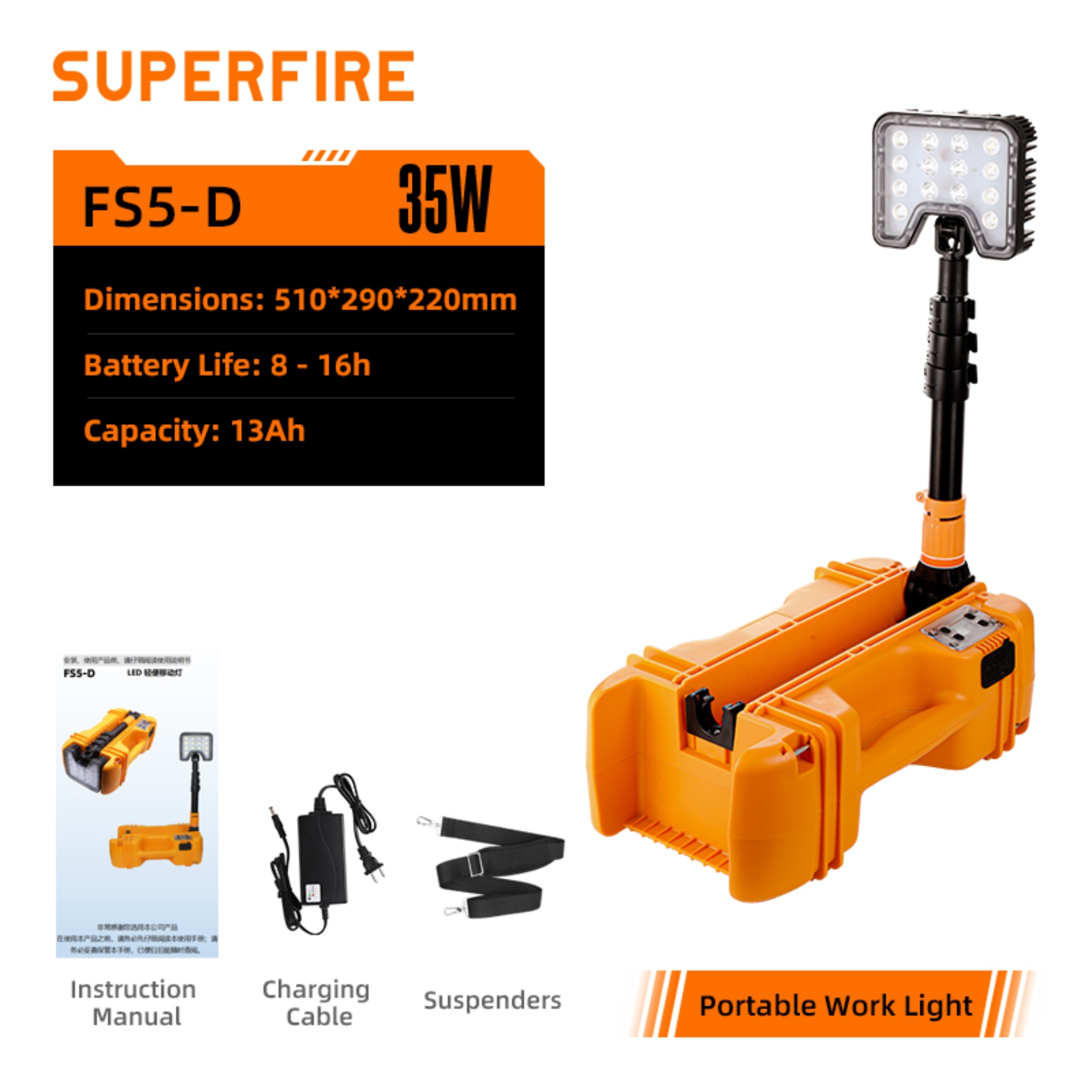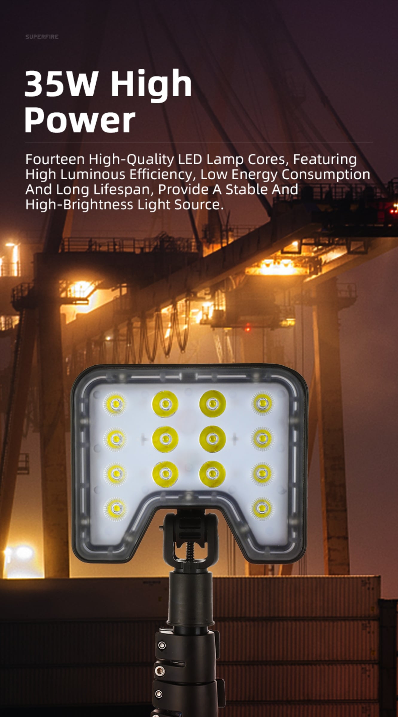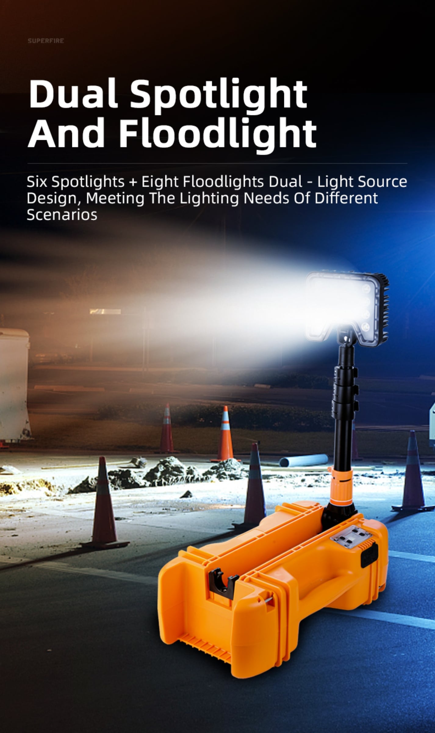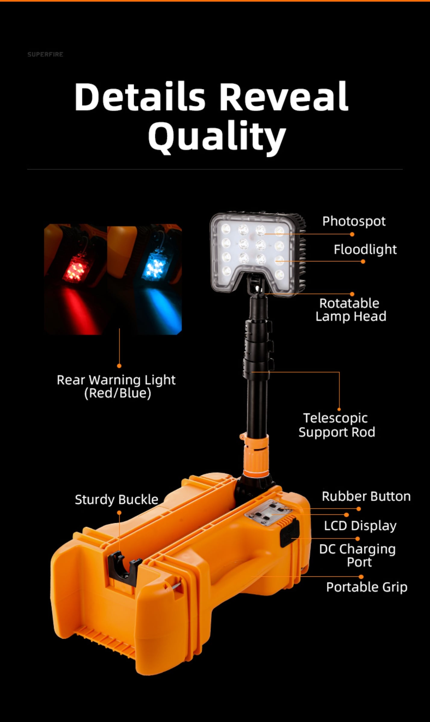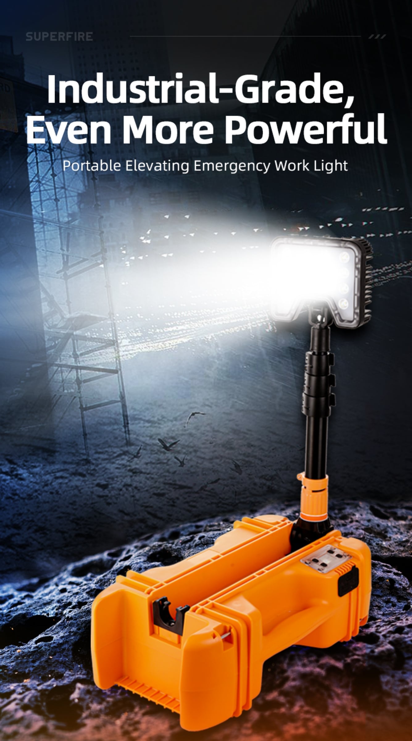 Place the light on a stable surface. Check whether the yellow locking collar at the bottom of the telescopic pole is in the closed position. In this state, pull the lamp head out from the housing and raise it until the pole is vertical. Then twist the yellow locking collar downward to secure the pole. After that, lift the lamp head into position. The lamp head supports 340° horizontal rotation and 160° vertical tilt.
