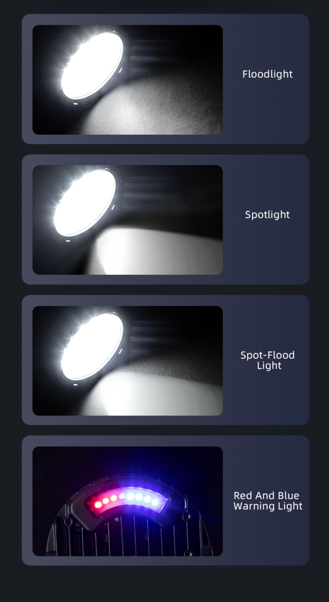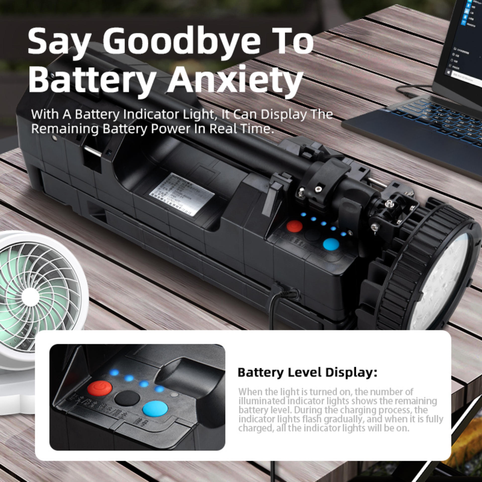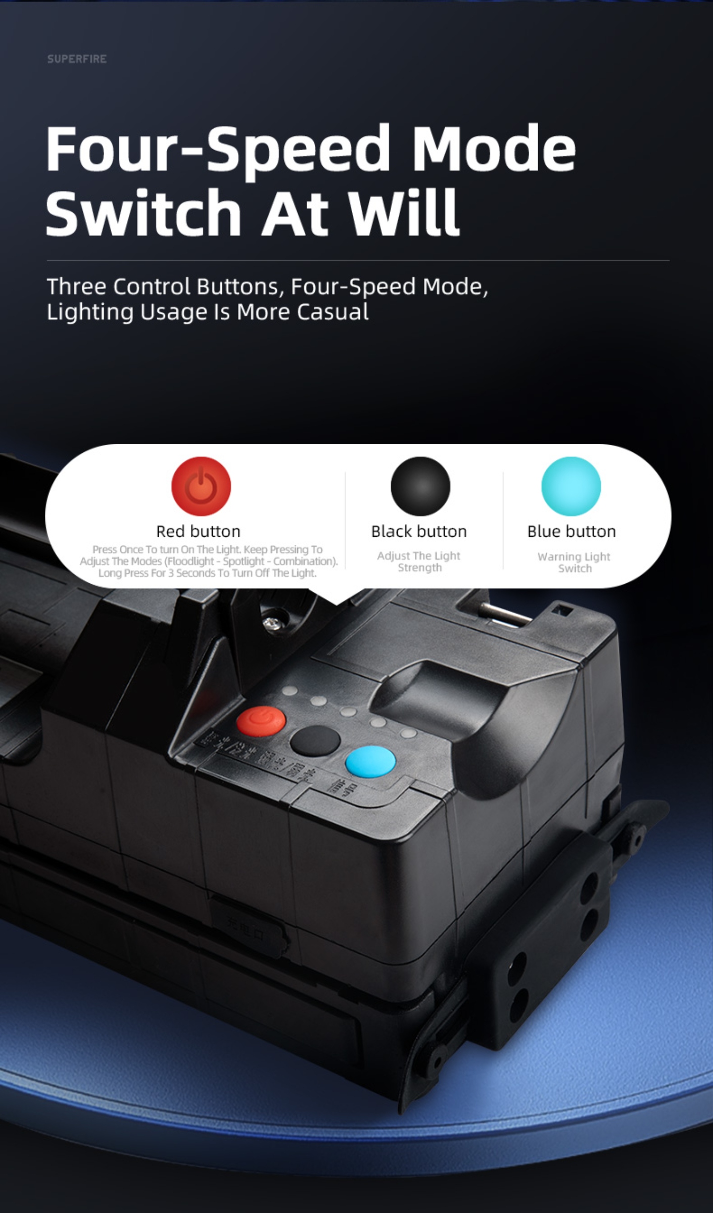 After adjusting the height of the lamp head, press the red button on the box to turn on the light, and the order is floodlight → spotlight → flood-spotlight combination. Then adjust the irradiation angle and direction of the lamp head according to actual needs. The black button can adjust the conversion between strong light and weak light, and the blue button can turn on the warning light on the back of the lamp head. Press and hold the red button for 3 seconds to turn off the light in any state. During charging, the indicator light flashes gradually, and the indicator light is fully on when fully charged. Please check the remaining power (the number of power display lights when turned on) before using the lamp, and charge it in time when the power is low.