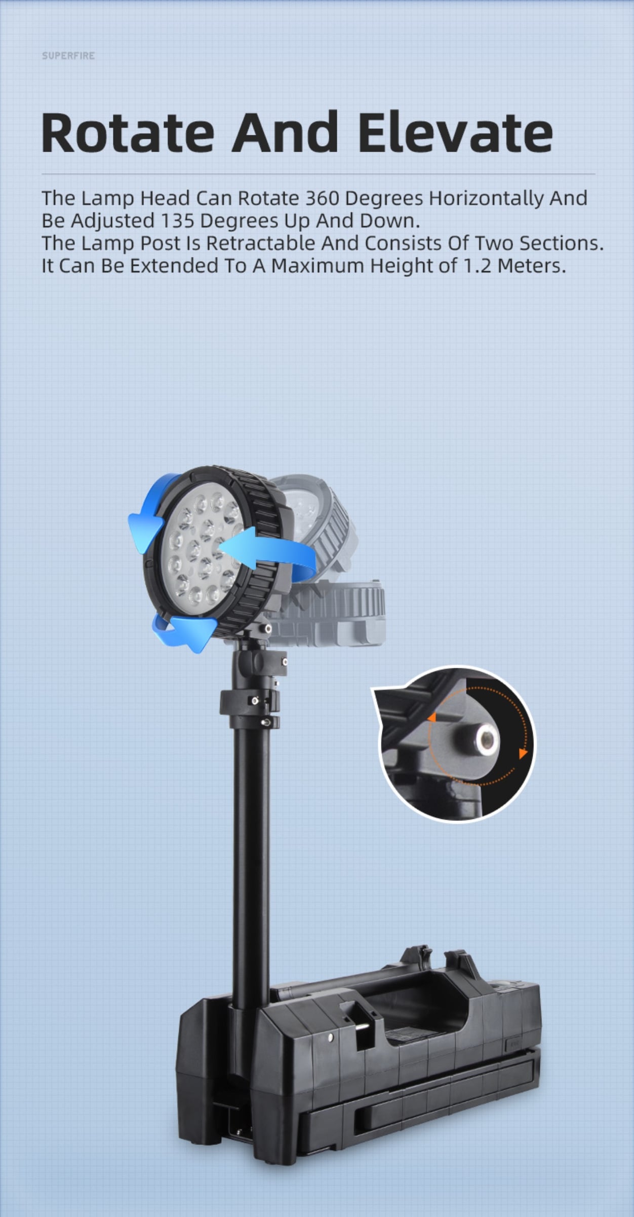 After placing the lamp stably, open the supporting foot components on both left and right sides to a 120-degree angle, then open the connecting rod of the right supporting foot, and lock the connecting rod of the right foot by pulling up the U-shaped bolt of the left supporting foot. Pull the lamp head lifting rod to the vertical state, and it will lock automatically (to unlock, pull up the iron piece at the bottom of the lamp rod). Then stand up the lamp head, which can rotate 360 degrees horizontally and flip 135 degrees vertically. The lamp rod is telescopic in two sections, with a maximum height of 1.2 meters, and each section corresponds to a pressure ring that can fix the height of the lamp rod.