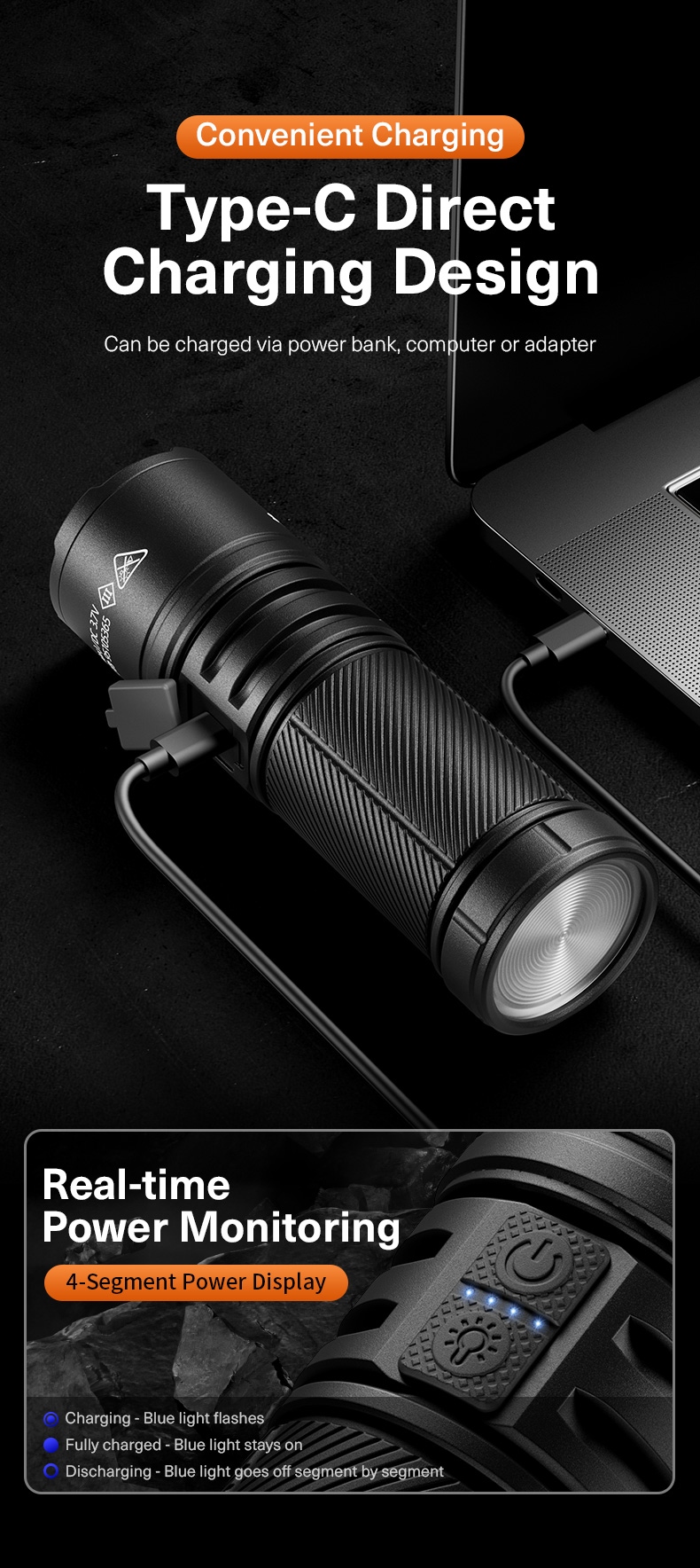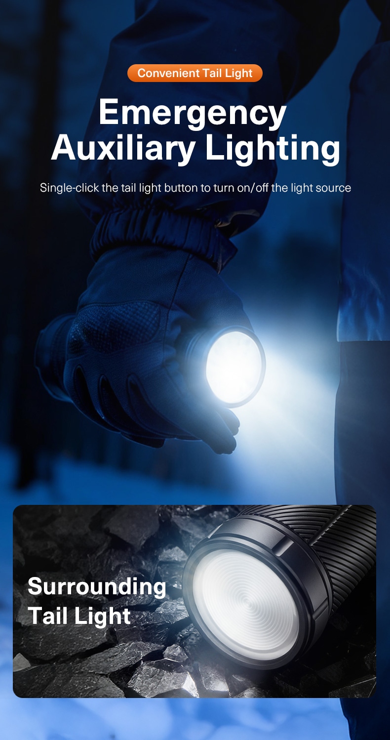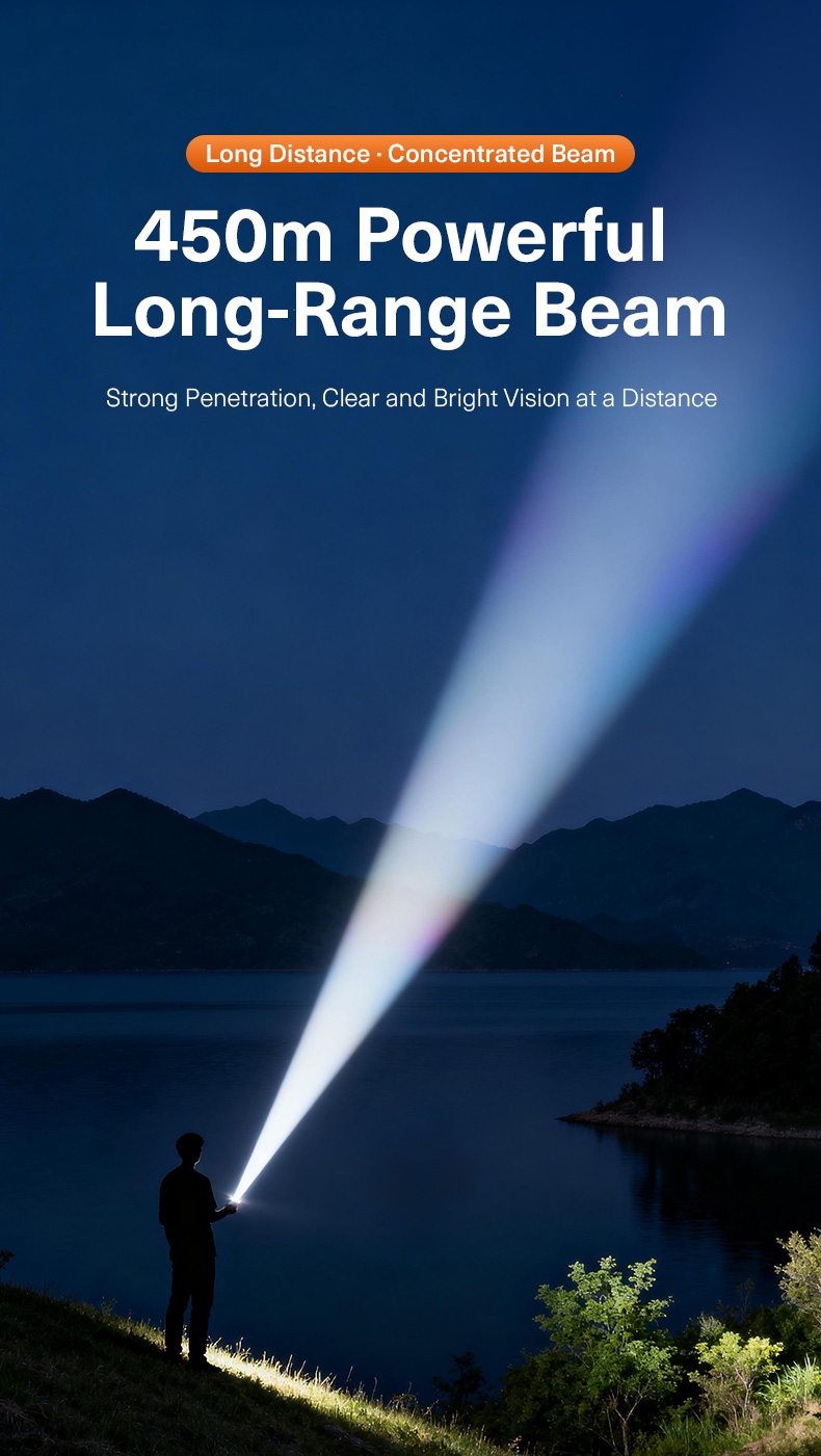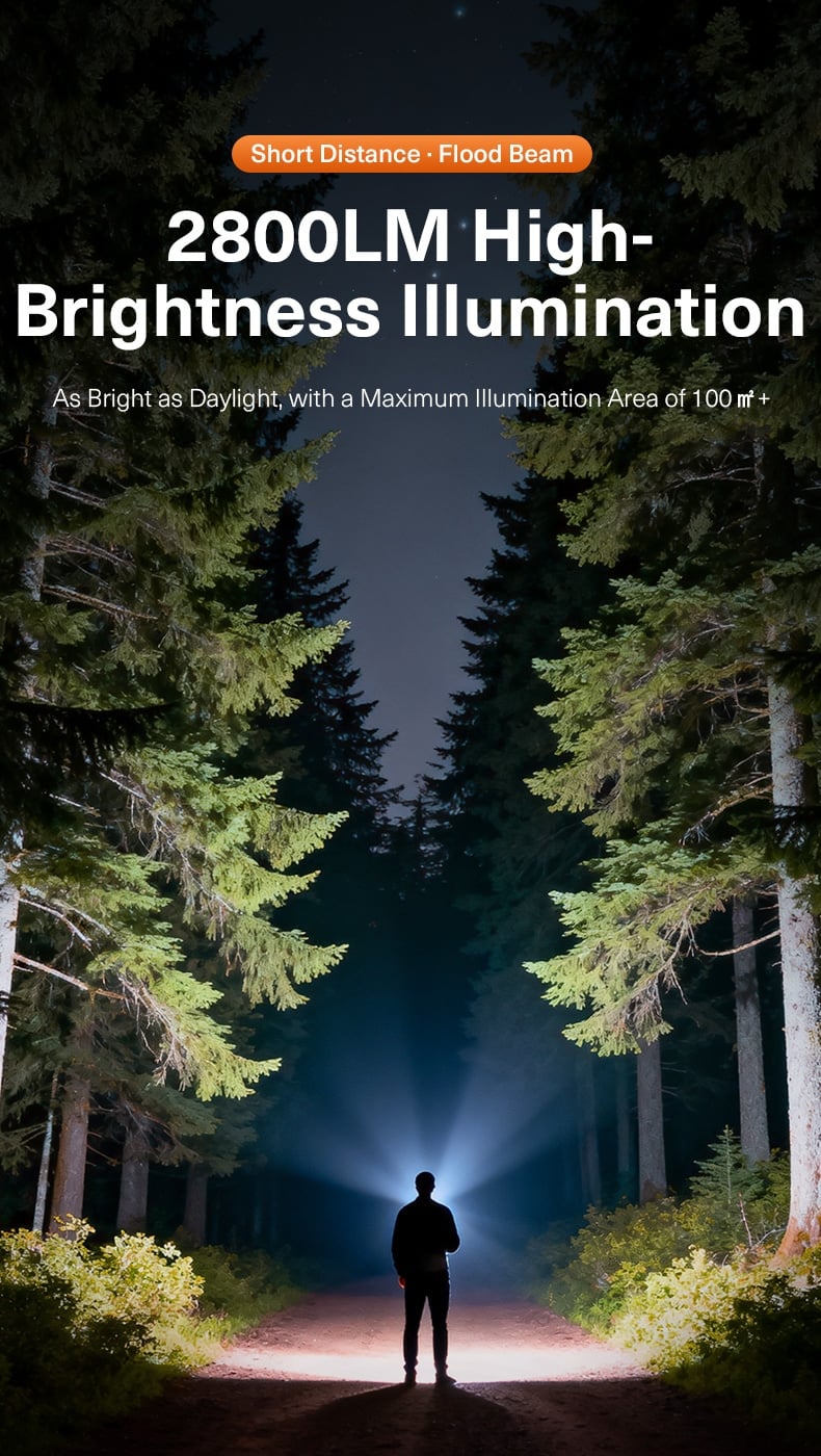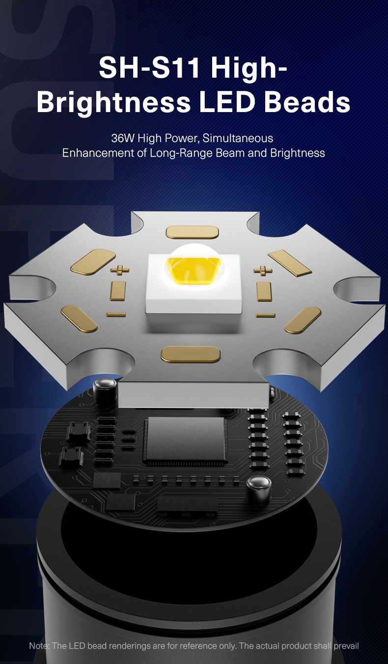 High Power & Long-Range Illumination: Adopts SH-S11 lamp bead and 36W rated power, generating 3100LM high brightness and 8000K cool white light. The 370-meter long射程 ensures wide and clear lighting coverage, easily coping with outdoor exploration, night work and emergency rescue needs.