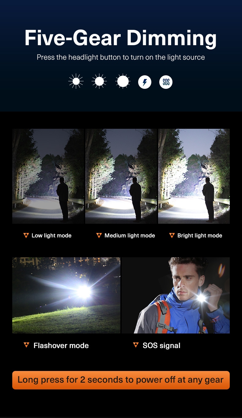 Flexible Zoom & Multi-Gear Lighting: Supports telescopic zoom by sliding the lamp head, switching freely between floodlight (for wide-area lighting) and spotlight (for long-distance focusing). It has 5 lighting modes (low light - medium light - high light - strobe - SOS) with cyclic switching, and one-key shutdown by long pressing for 2 seconds, meeting diverse lighting demands.