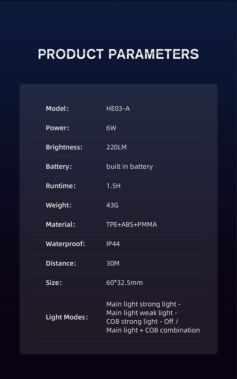 The HE03-A is a multifunctional induction headlight with a 6W power output and 220LM brightness. It comes with features like smart hand-wave sensing at a 10CM golden distance, TYPE-C fast charging using a common interface. It's lightweight, weighing only 44g, and is waterproof for daily life. The headlight has an independent button design for easy operation and 5-speed adjustment to suit different scenarios. It's suitable for users who need lighting for outdoor activities or home use.