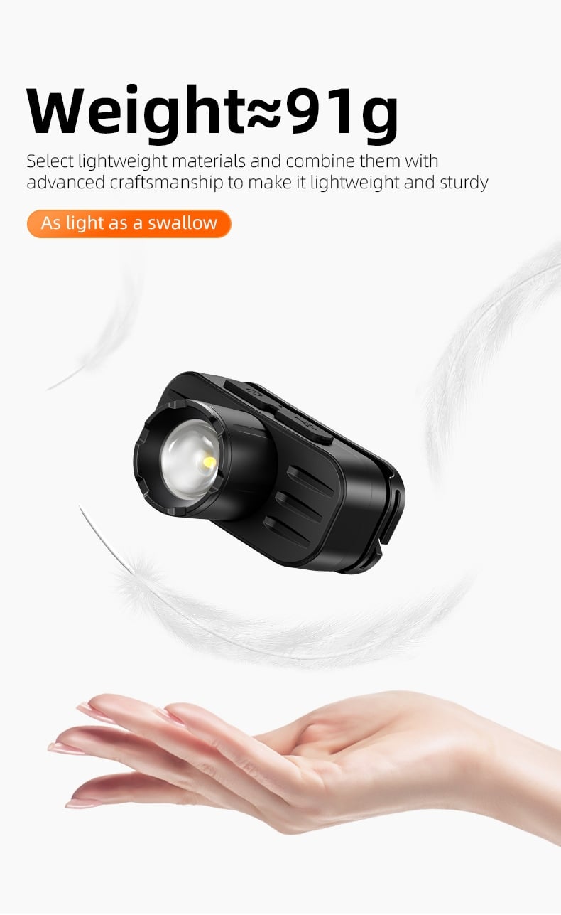 Lightweight & Comfortable Wearing: Weighs only 91g, the headlamp reduces pressure on the head for long-time wearing. The soft and detachable adjustable headband fits different head sizes, and it's easy to clean, ensuring comfort and hygiene for daily use.