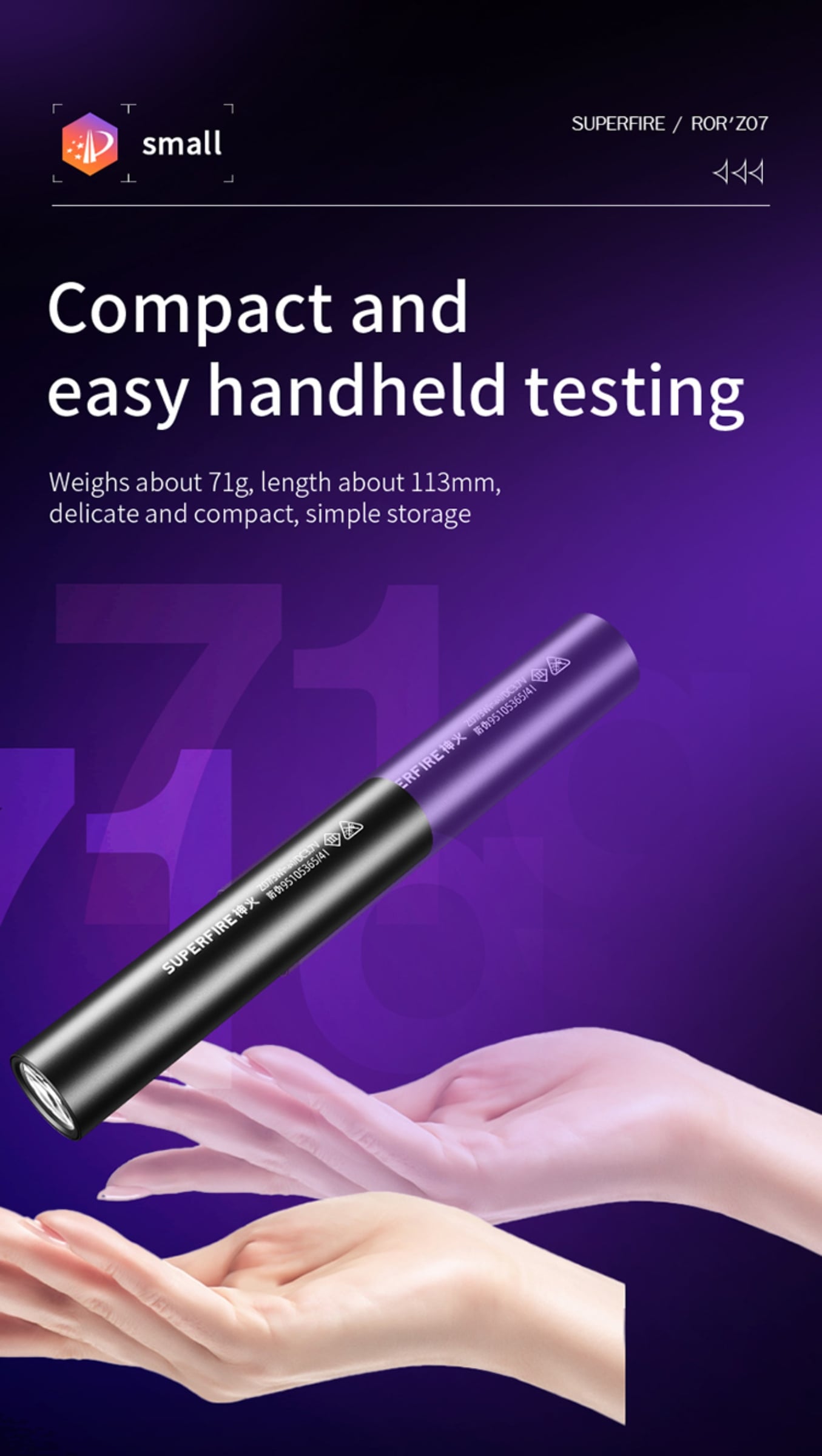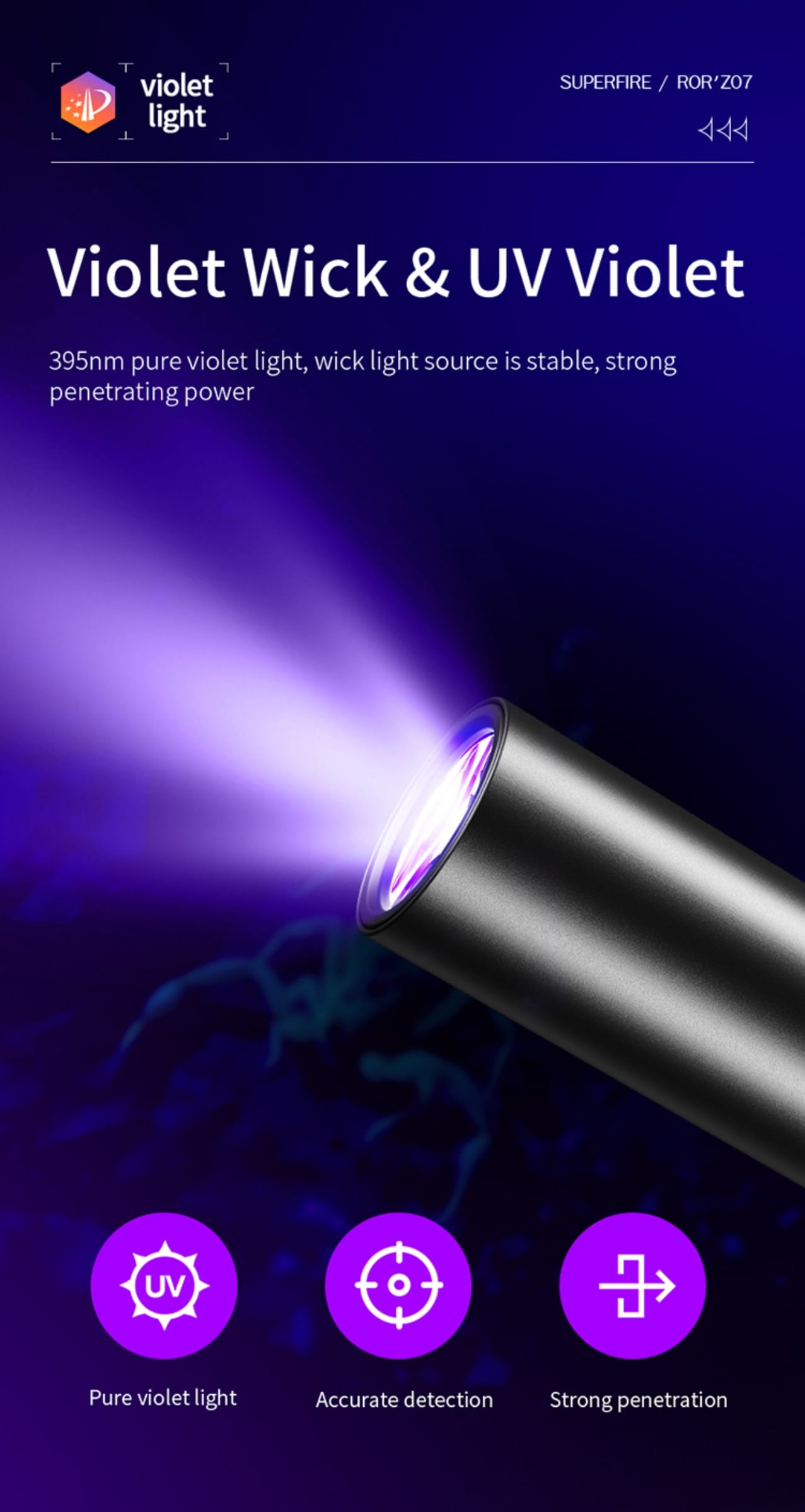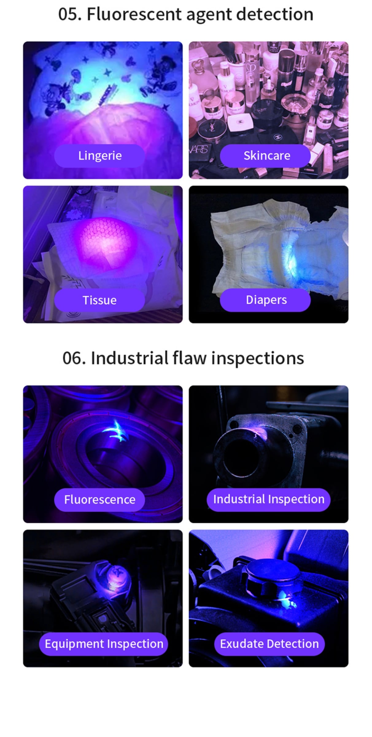 6. Pure purple light: 395nm purple light, multi-functional, can detect fluorescence, germs, anti-counterfeiting,