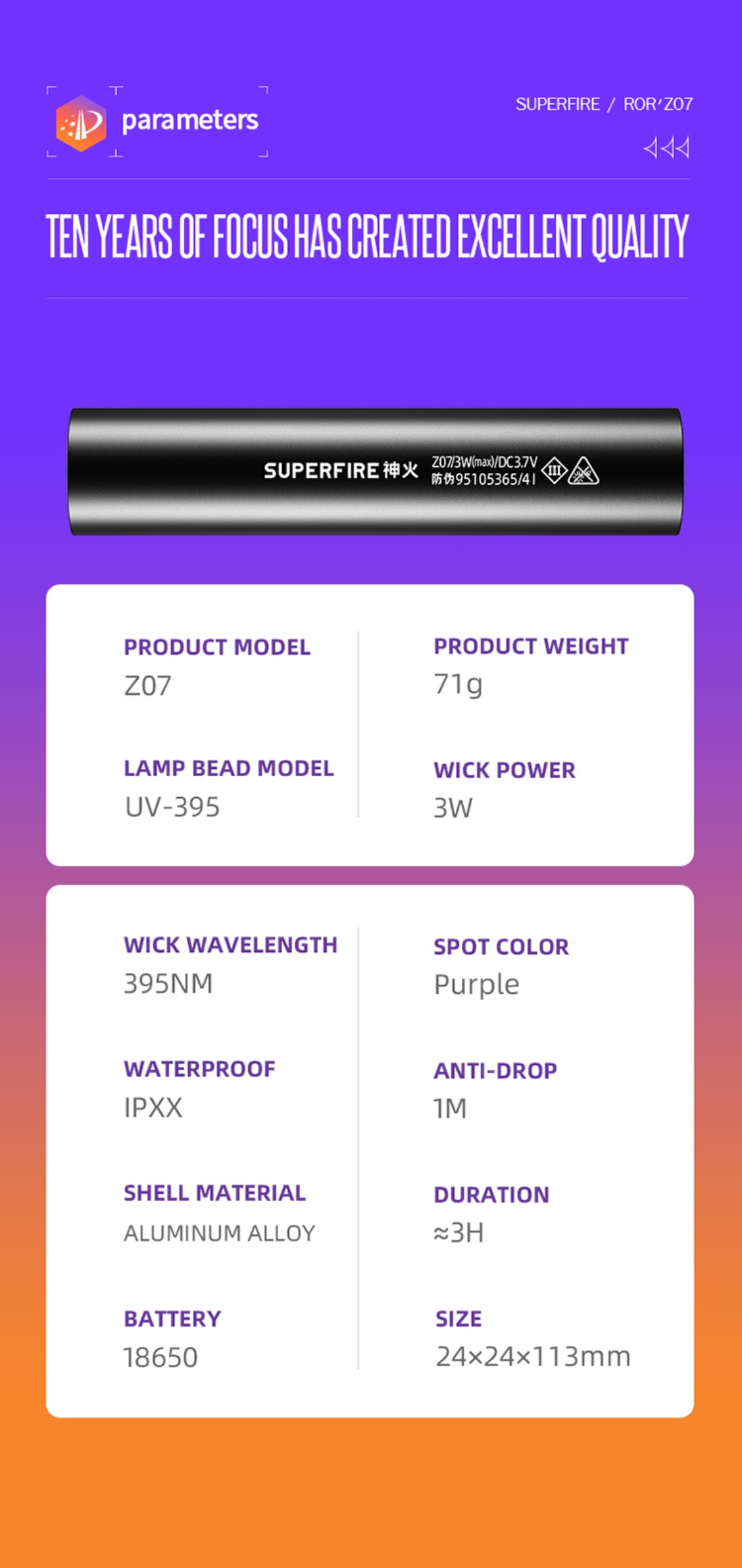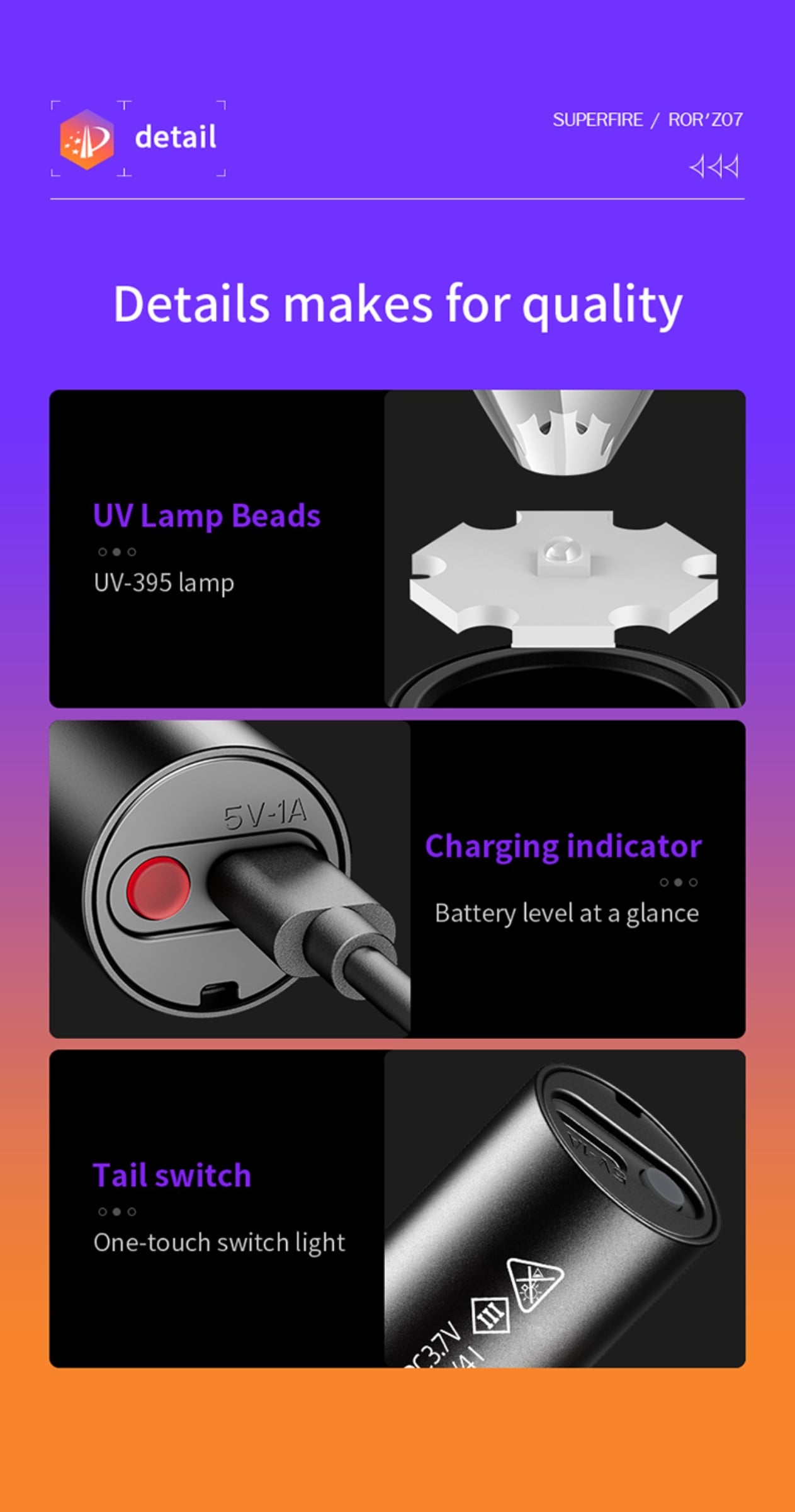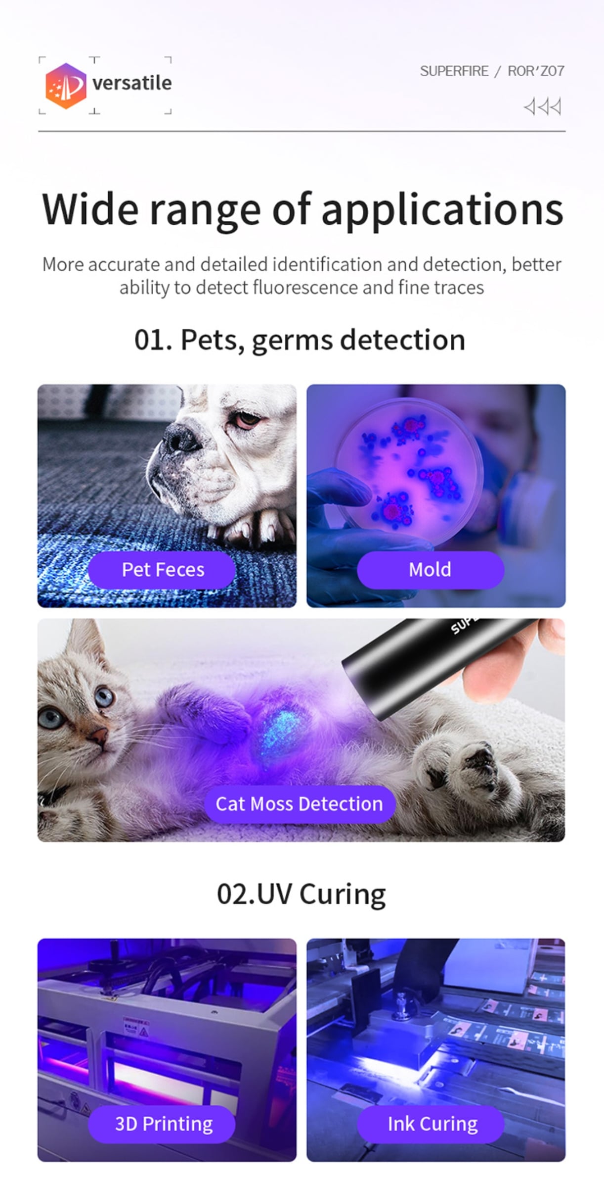 6. Pure purple light: 395nm purple light, multi-functional, can detect fluorescence, germs, anti-counterfeiting,