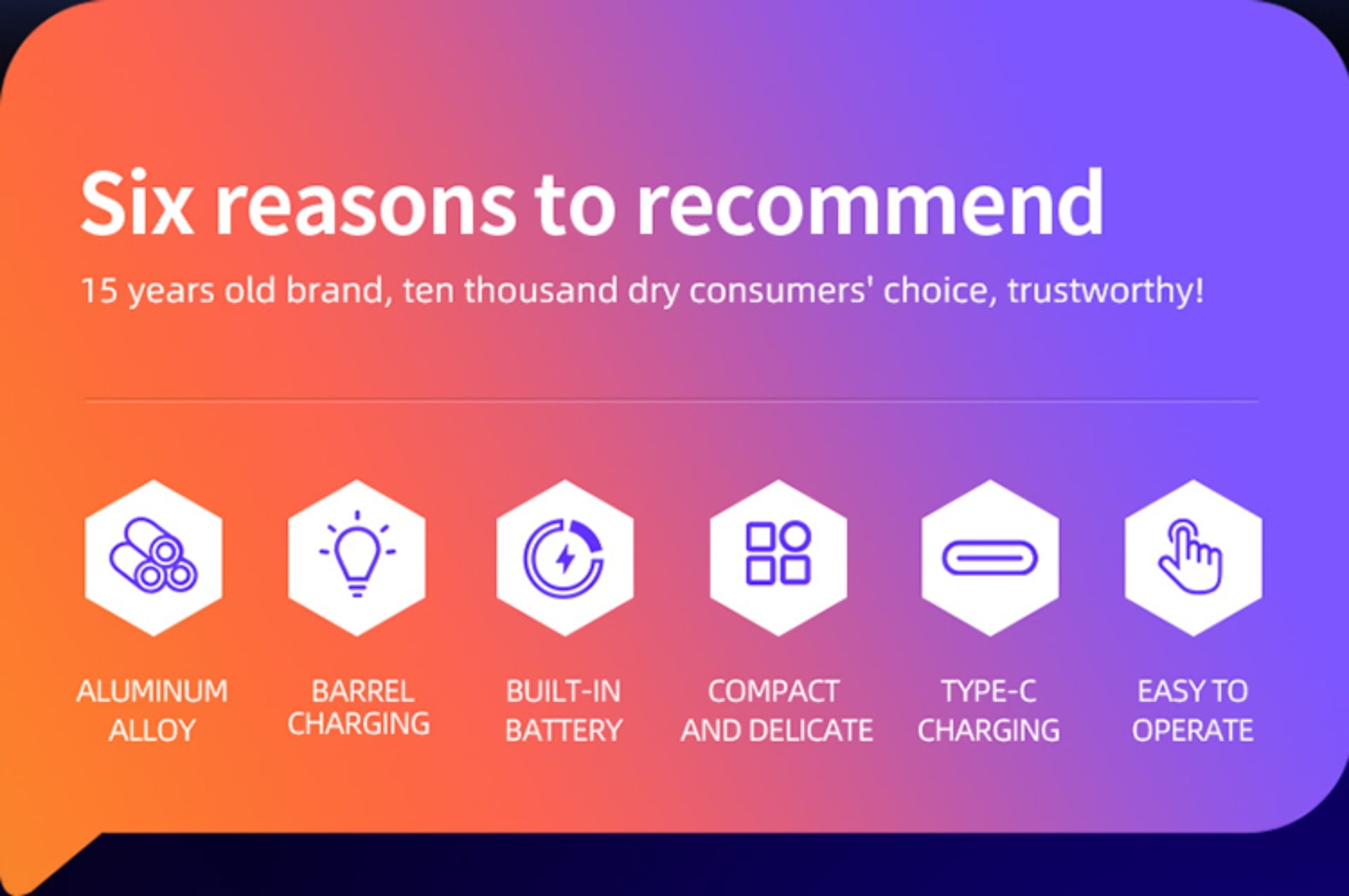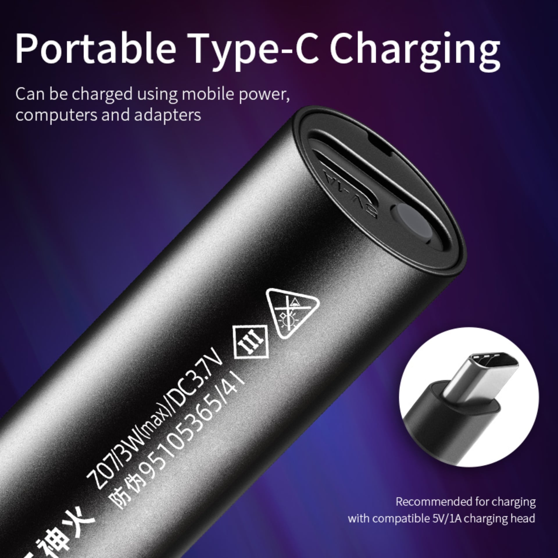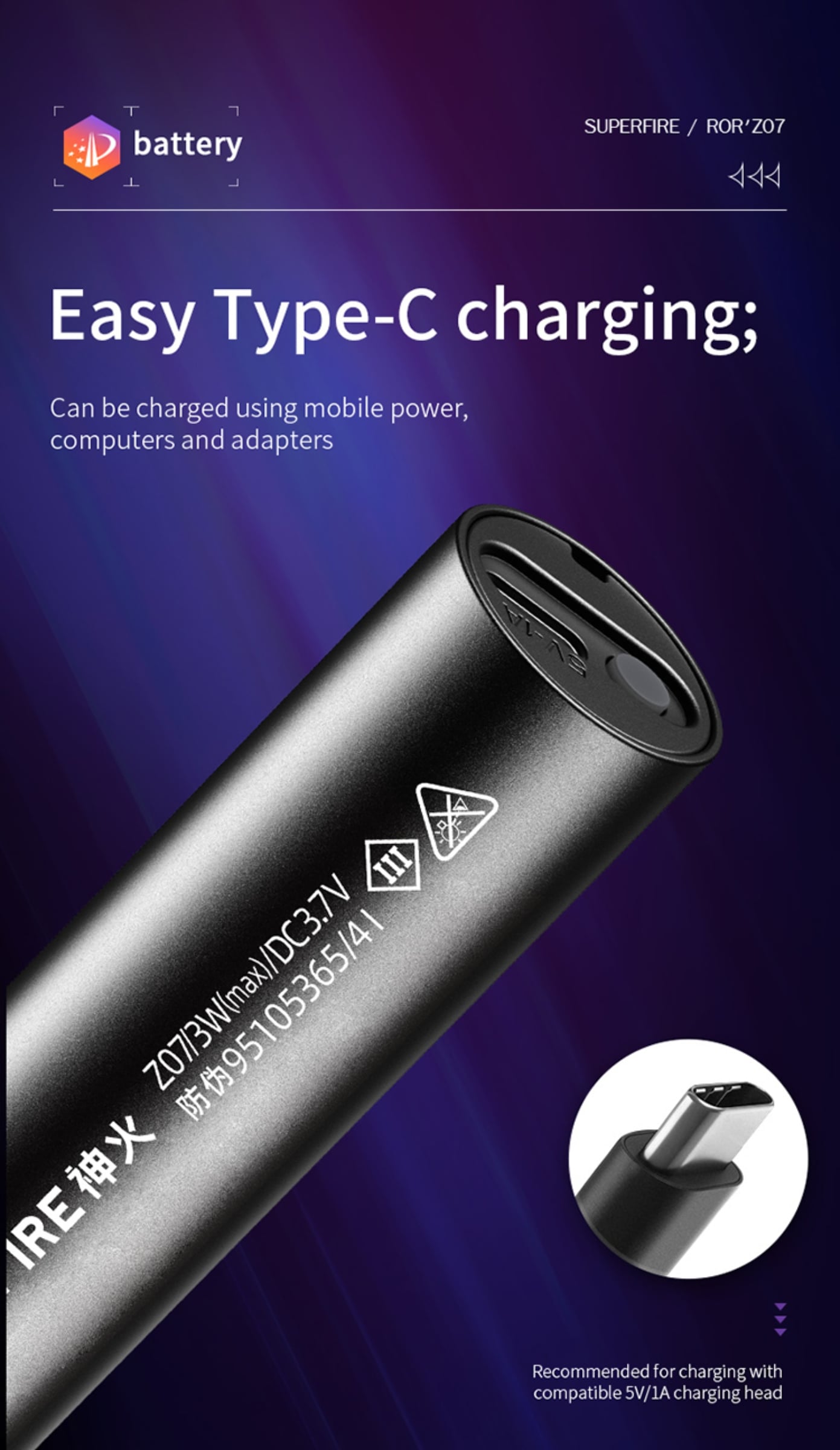 3. Diversified charging, easy to use: equipped with Type-C charging interface, you can use chargers, power banks, computers and other devices to charge the flashlight.