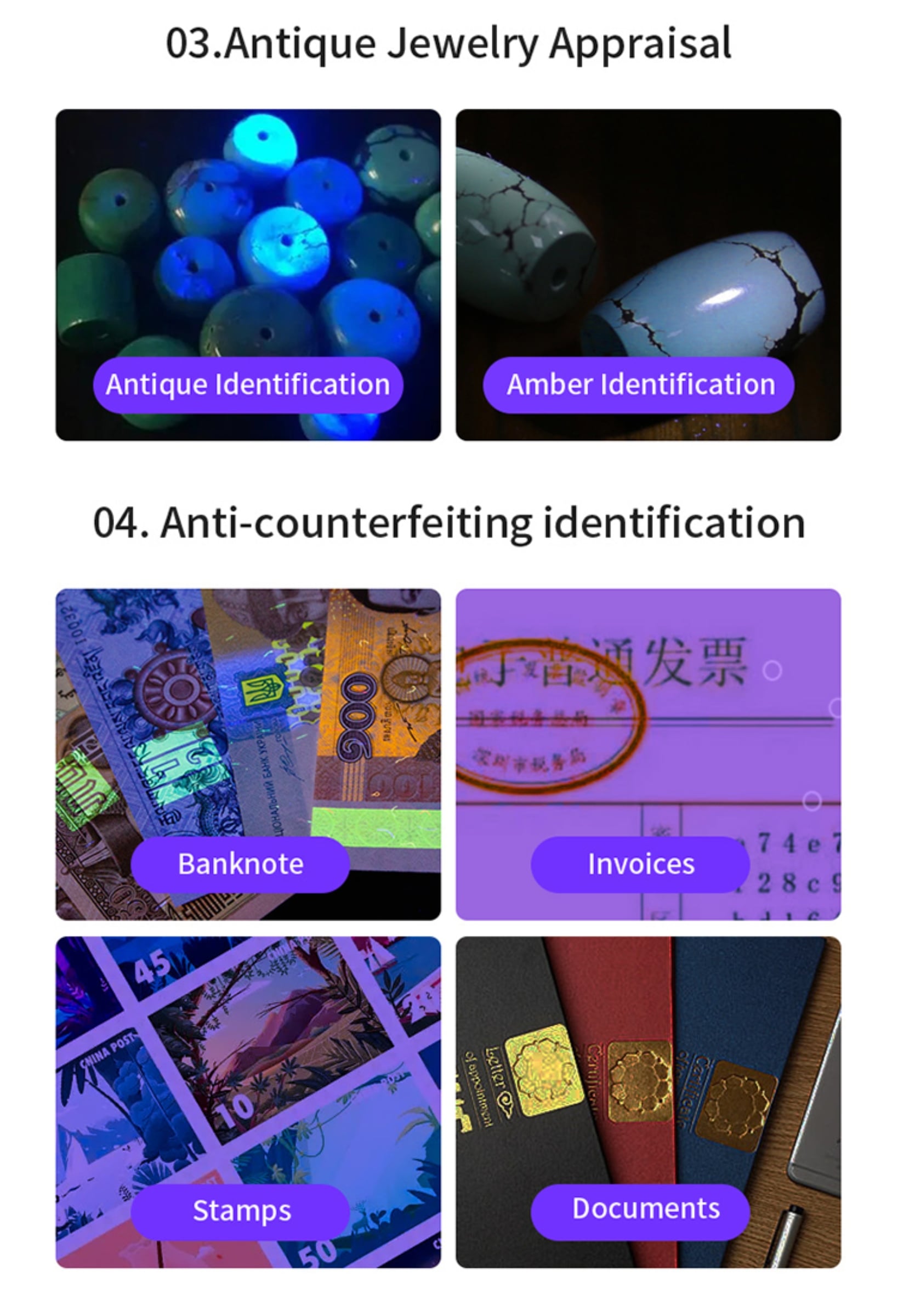 1. Purple light flashlight: can be used for banknote inspection, identification of fluorescent agents, pet fluorescence detection, identification of amber, beeswax, antique repair and identification.