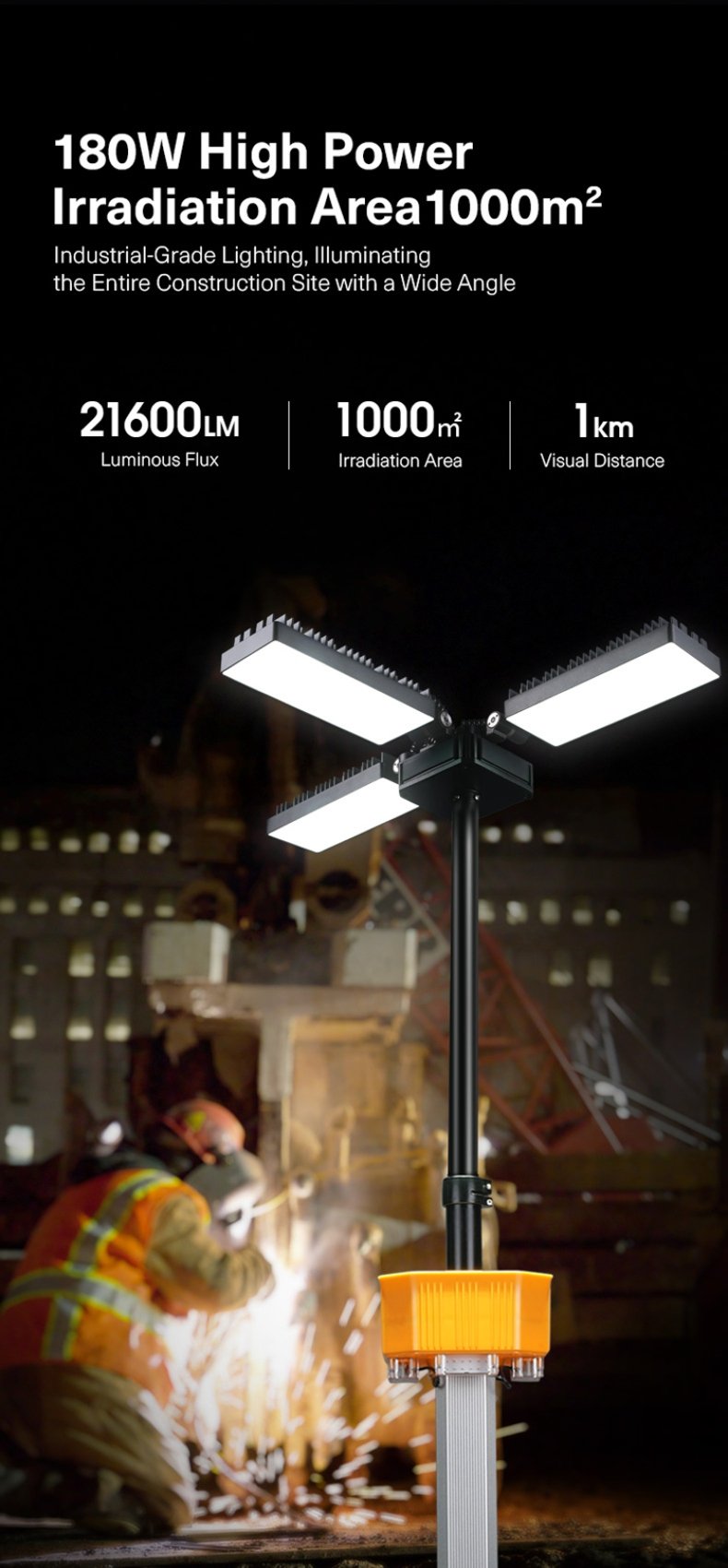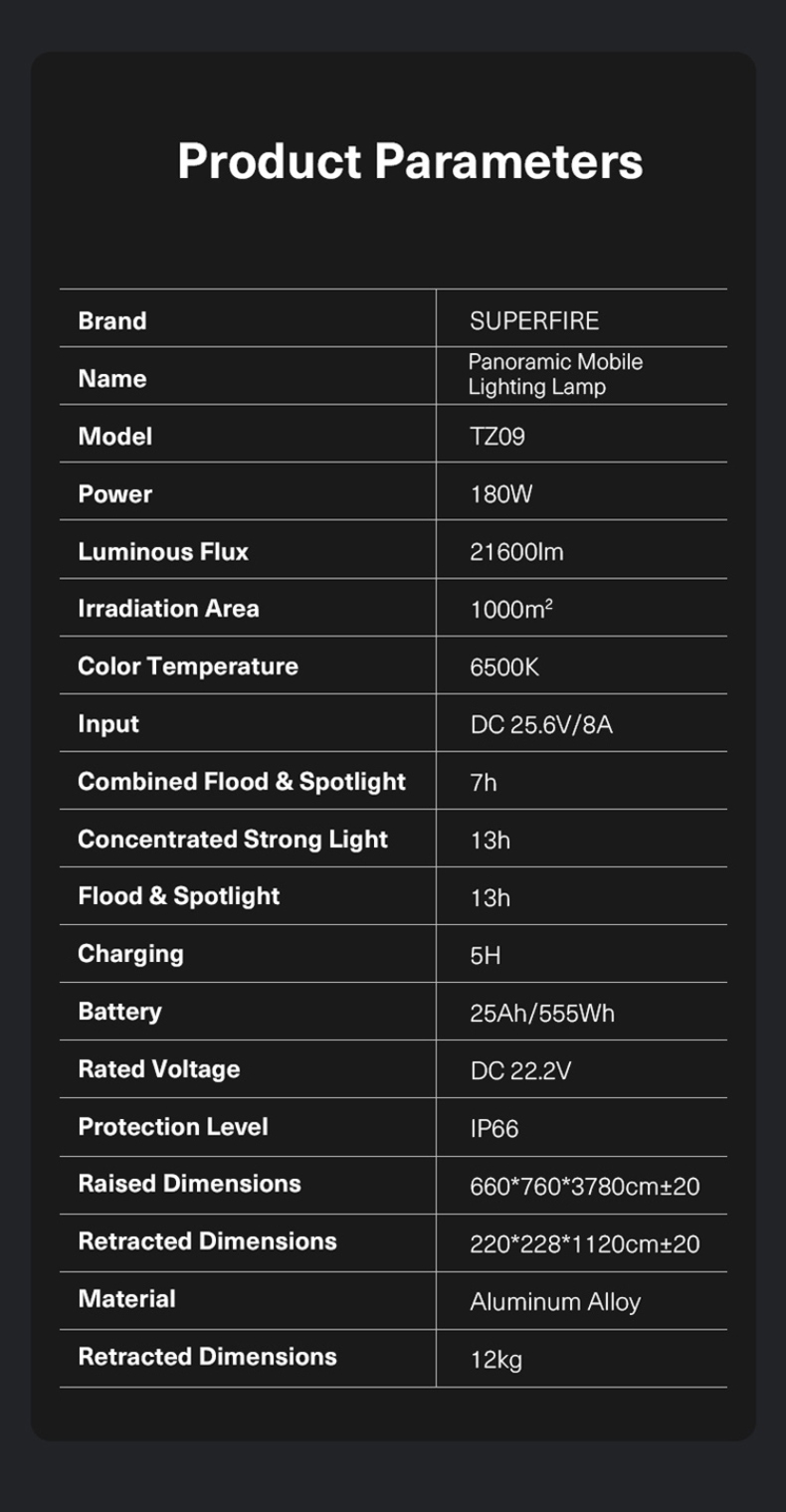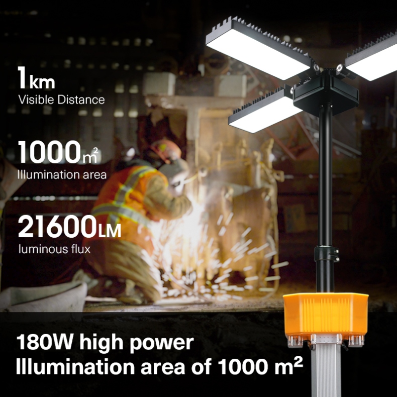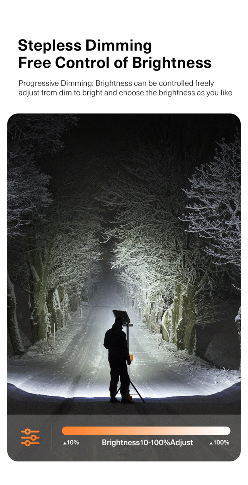 Telescopic Mast (5 Sections): The pole can be extended and retracted in five sections, allowing the light to reach a maximum height of 3.8 meters (about 12.5 feet), offering excellent flexibility in height adjustment.