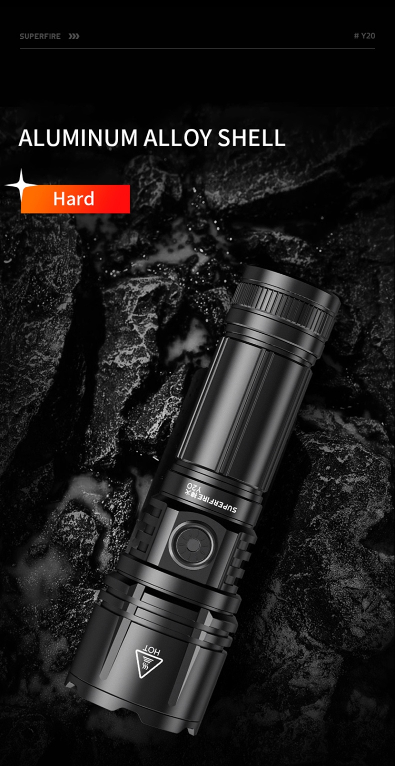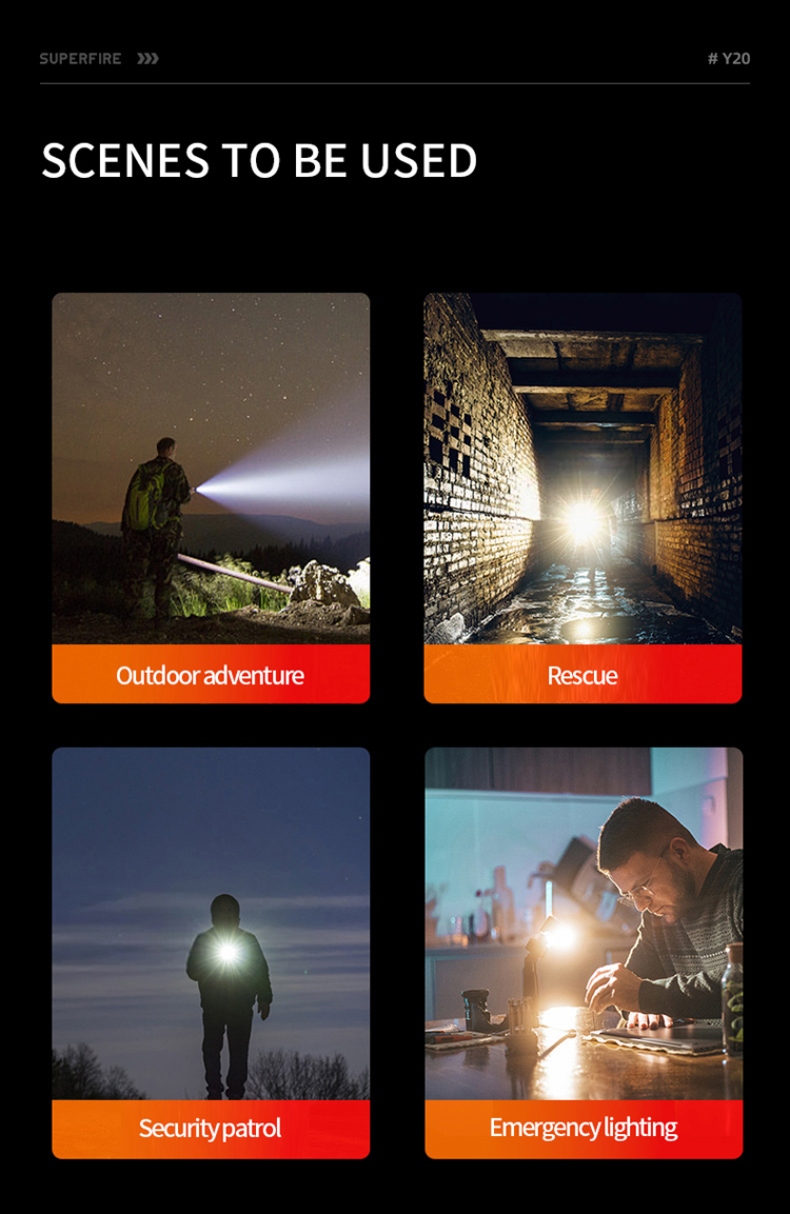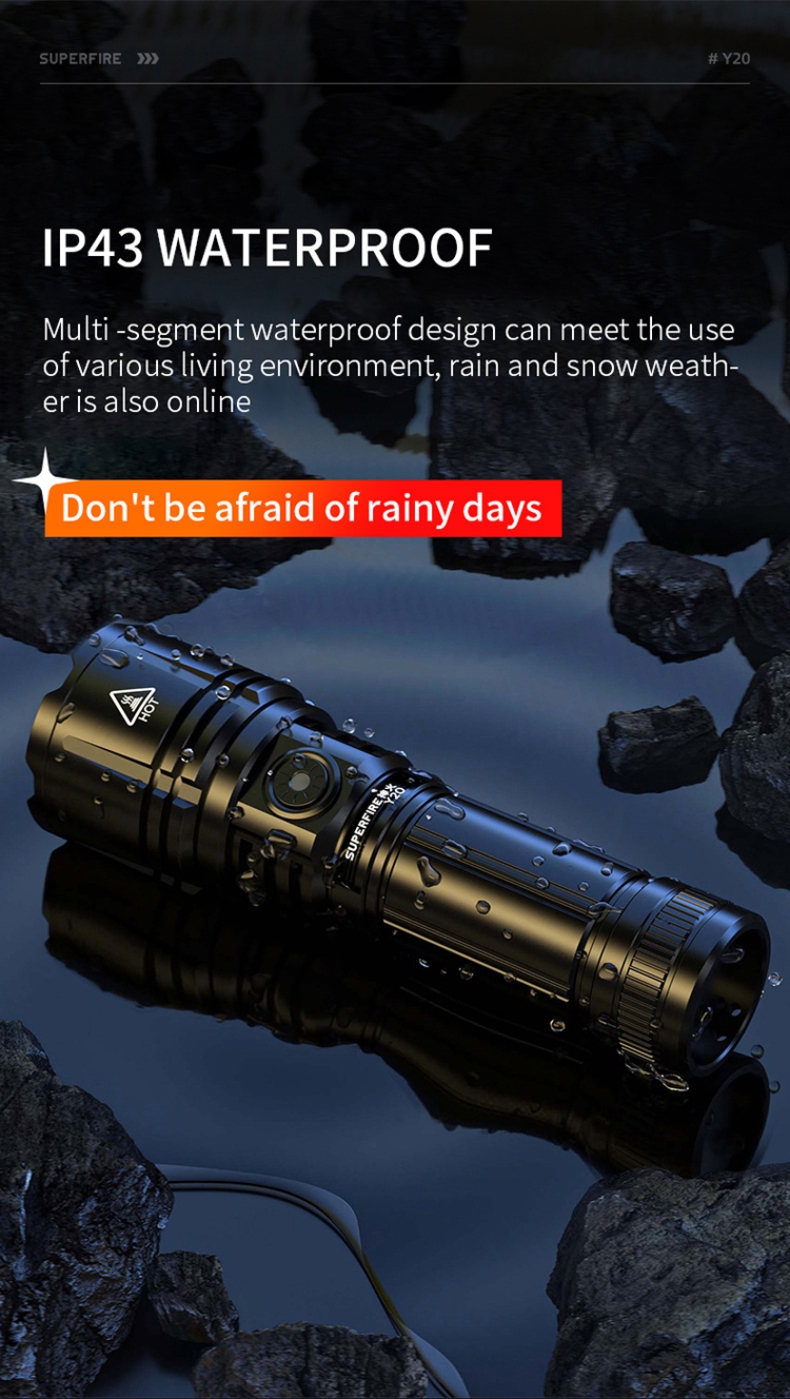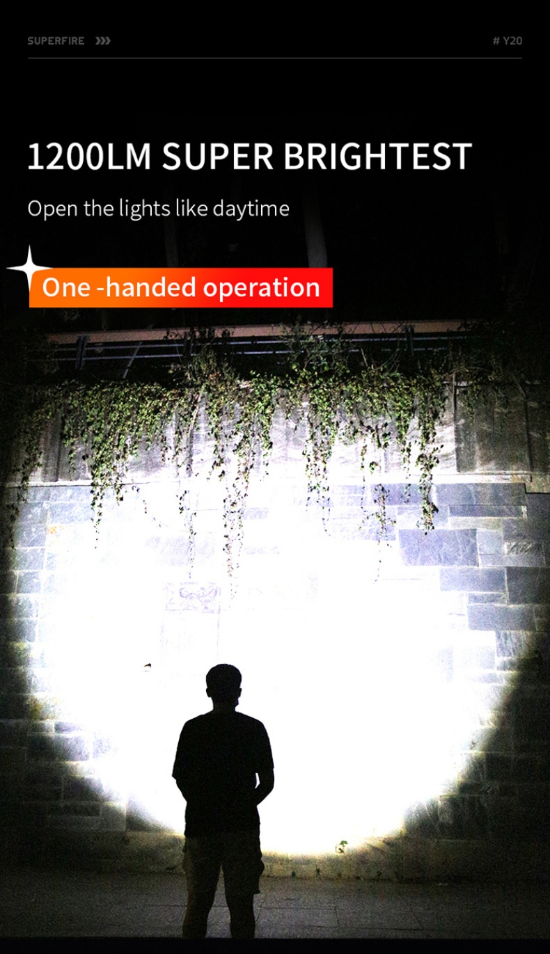 This flashlight can reach 1200LM.Open the lights like daytime.High brightness,700m long shot.Pierce the darkness,illuminate the future.Pan -light condensing with the heart, the emancipation of both hands is more comfortable, and the travel lighting is not tired.Click the middle switch to turn on the weak light and continue to adjust the file (weak light-mid-light-strong light).Click the Emergency button to turn on the sos, and prescirculating gear (SoS-Flash).Multi -segment waterproof design can meet the use of various living environment, rain and snow weather is also online.