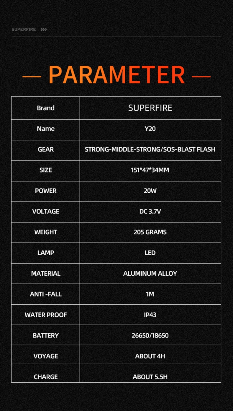 Mode: Low light-medium light-strong light-strobe-SOS-off