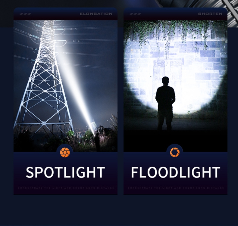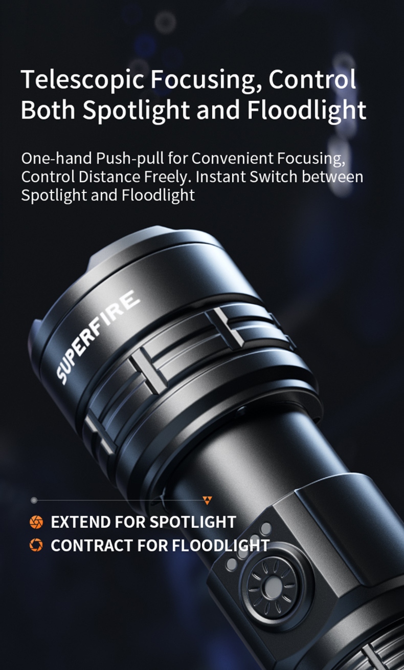 Telescopic Zoom & One-Hand Operation: Supports telescopic zoom function to adjust the lighting range freely (from wide floodlight to long-range spotlight); one-hand operation design makes switching on/off, dimming and zooming simple and convenient.