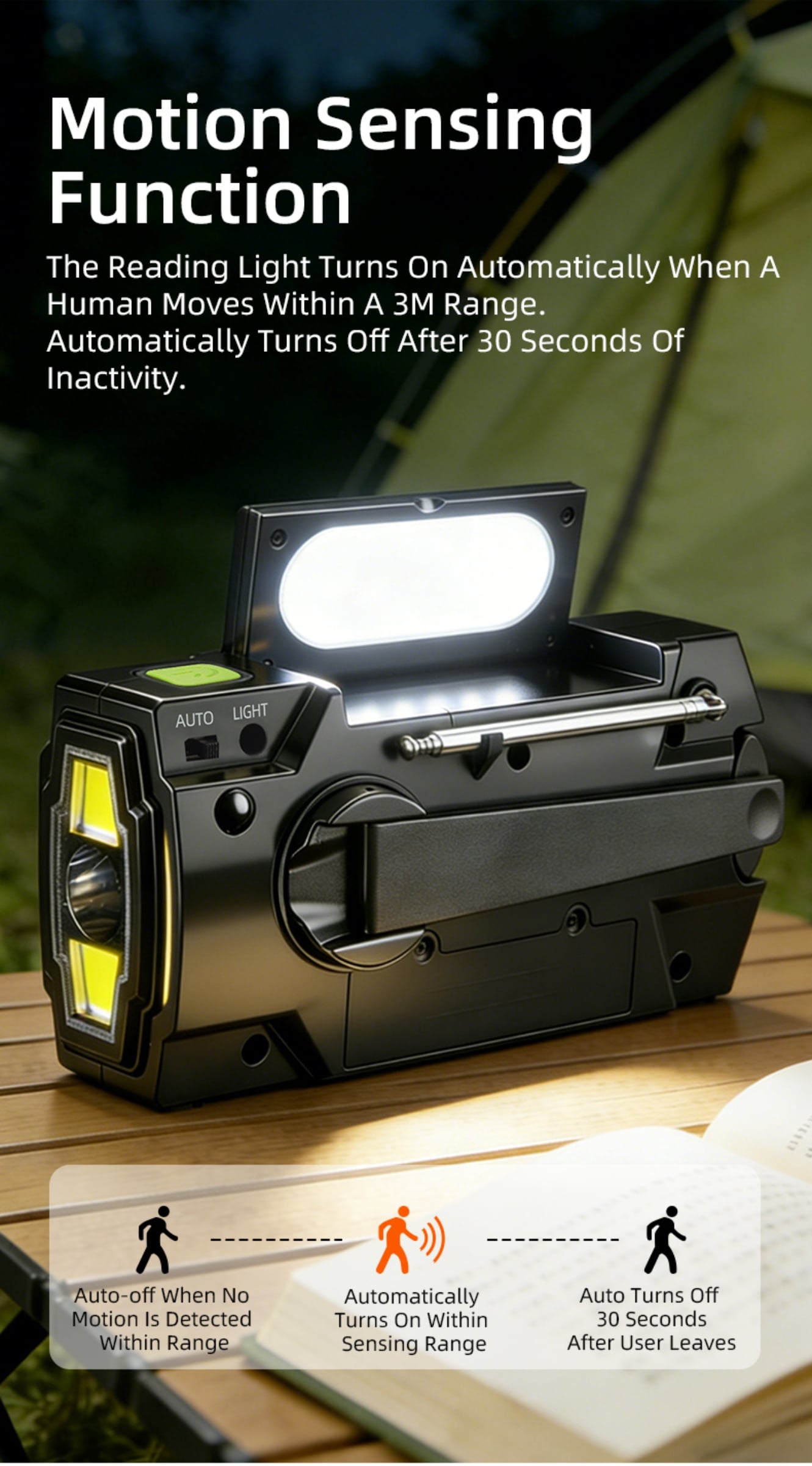 Versatile Lighting Modes: 135LM main light (long/short/dual-beam) plus motion-sensor reading light, with runtime up to 20 hours for reading.